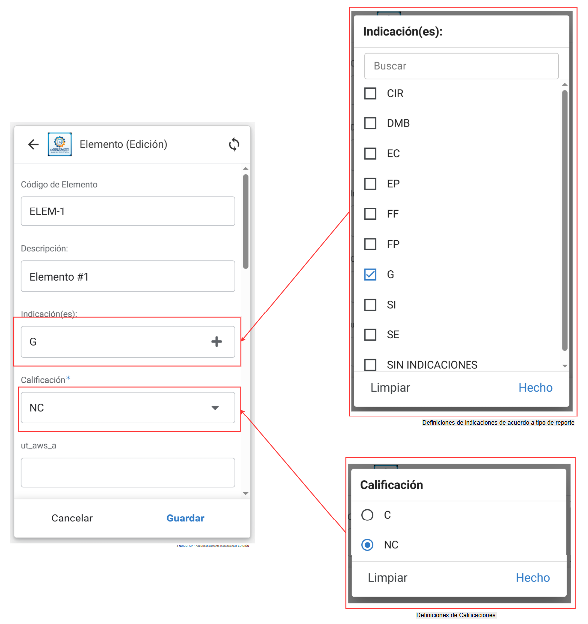 Fig 21 Vista de elementos inspeccionados en modo edición, con listado de tipos de indicaciones y calificaciones en e-NDICC-ERP