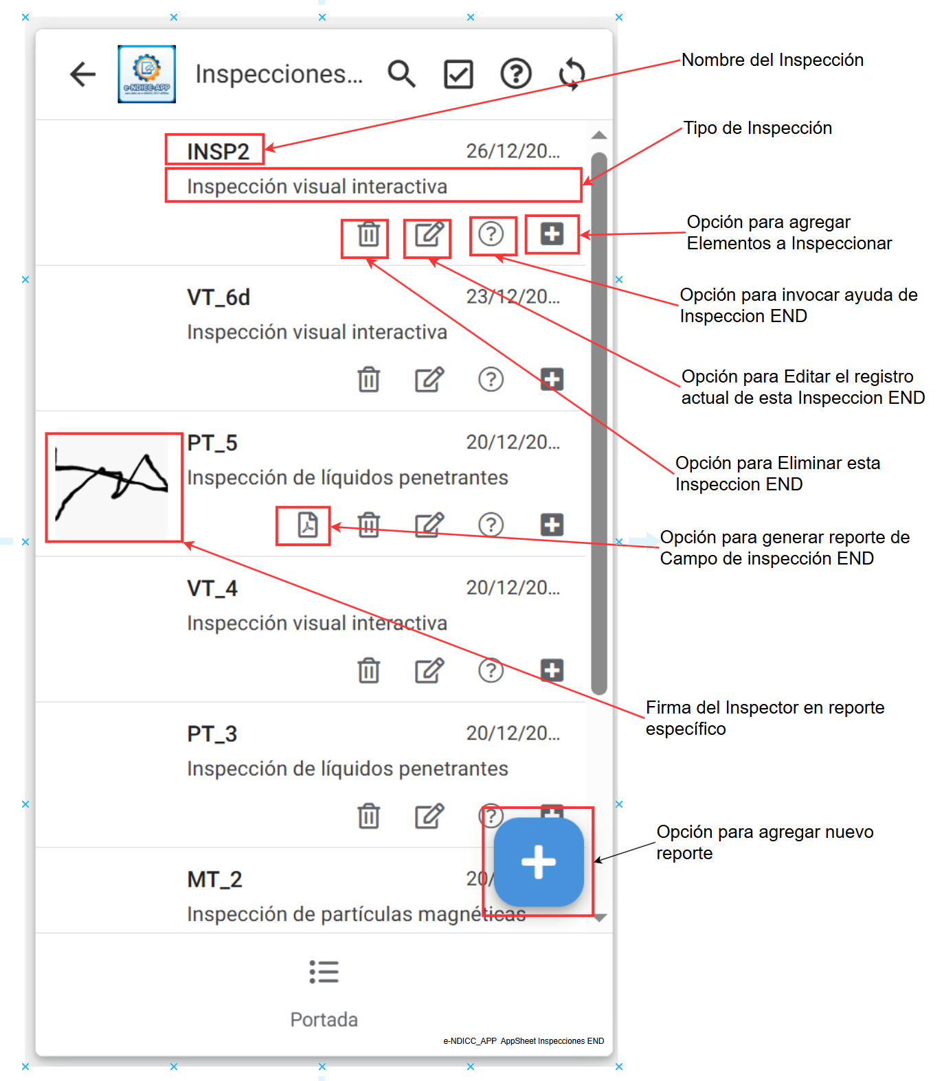 Luego de haber seleccionado la opción Inspecciones END, se mostrará una vista similar a la siguiente imagen