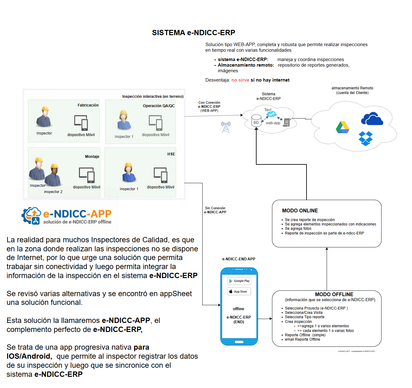 Fig 3 Esquema de los Sistemas e-NDICC-ERP + e-NDICC-APP, ambos integrados con capacidad de de funcionar con/sin conectividad
