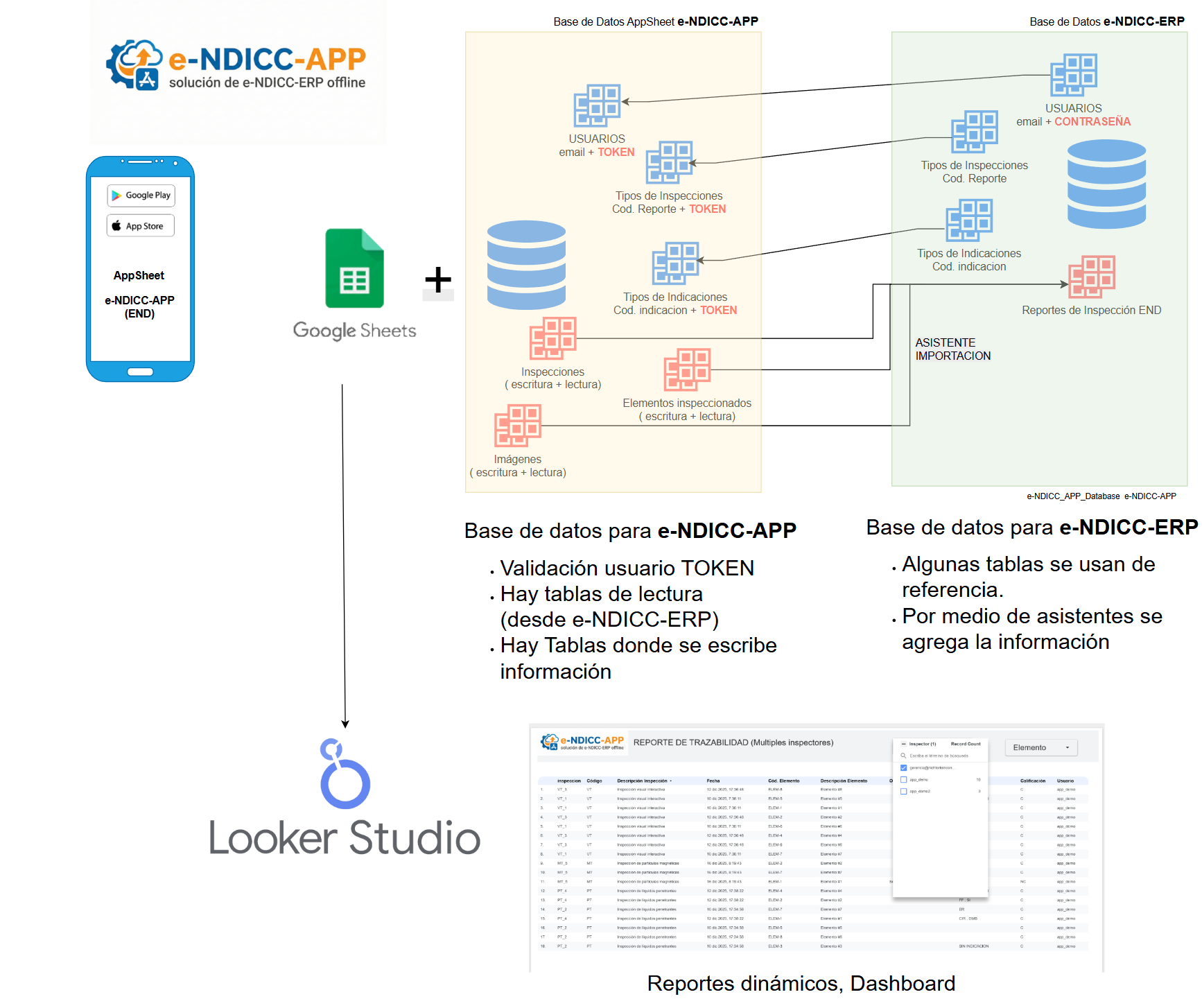 En e-NDICC-APP, su base de datos no se limita a la hoja de calculo de Google, sino que se emplea una base de datos que se comunica con el sistema e-NDICC-ERP, ya sea para obtener información (tipos de inspecciones, indicaciones, etc) como tambien para guardar información que será importada a reportes que maneja el sistema e-NDICC-ERP con mayor flexibilidad