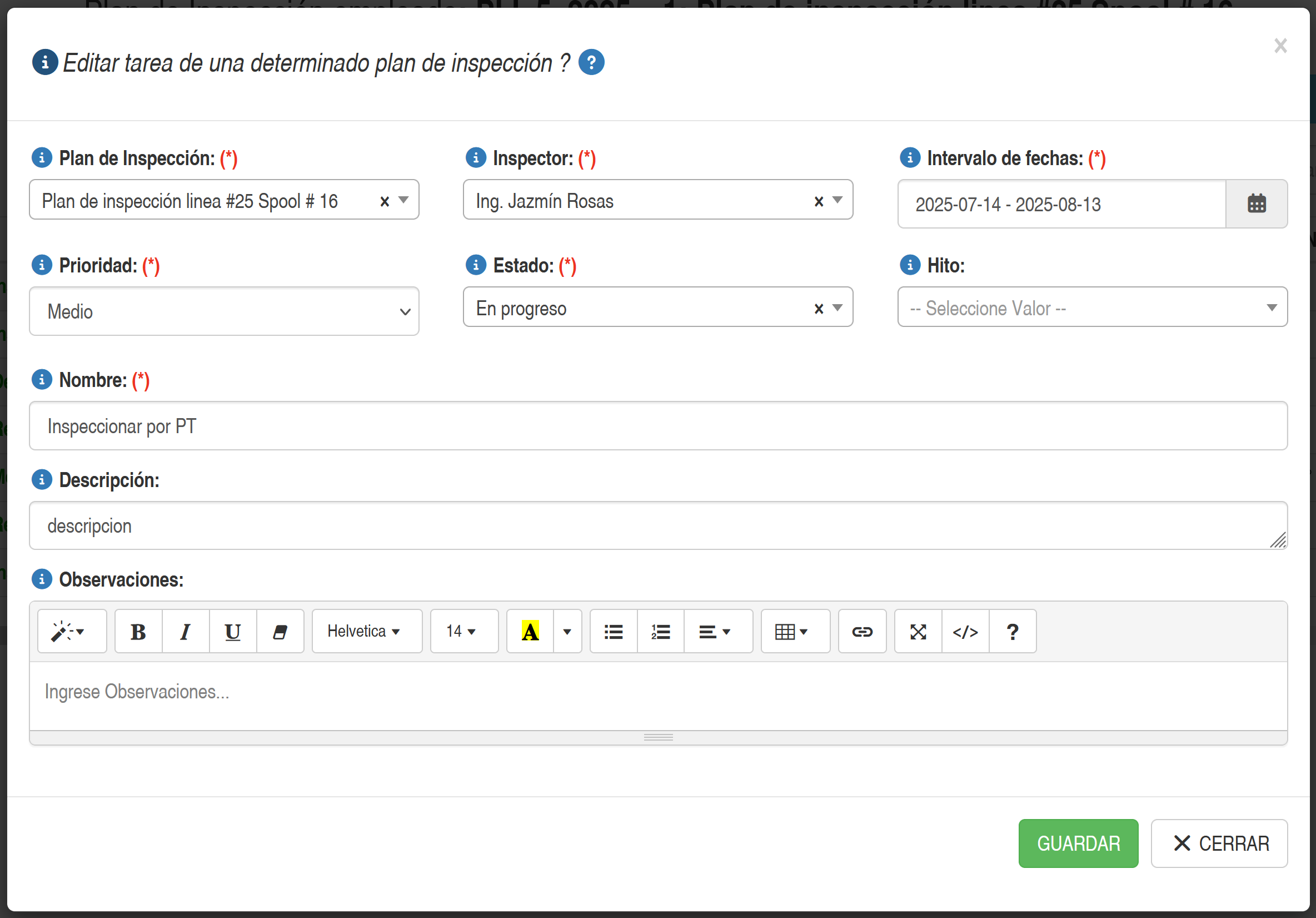Al presionar el botón Editar o Agregar de una determinada tarea del Plan de Inspección, se presentará una ventana emergente tal como se muestra en las figura a continuación.
