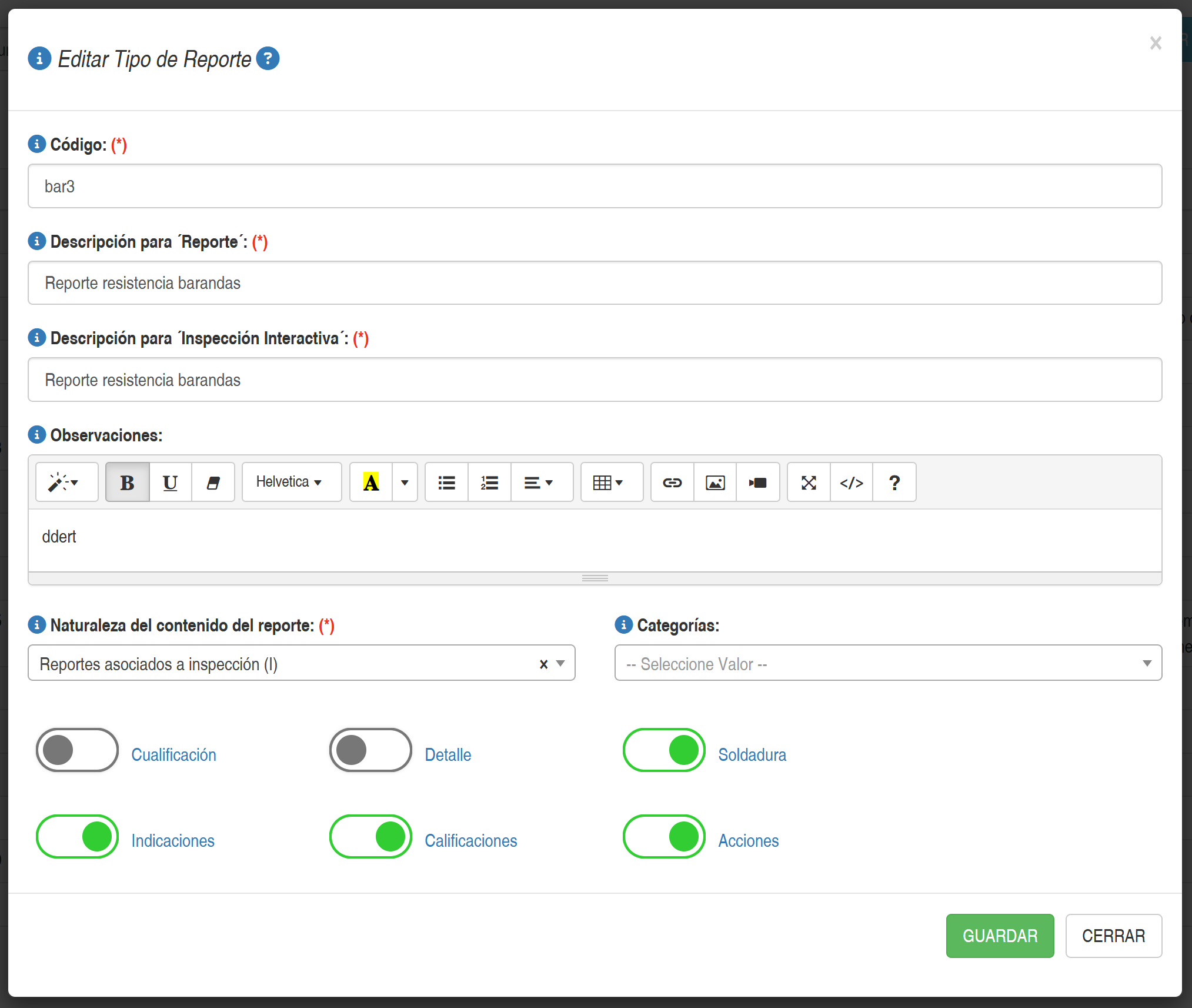 Fig 577 Ventana emergente , "editar" tipo de Reporte en e-NDICC.