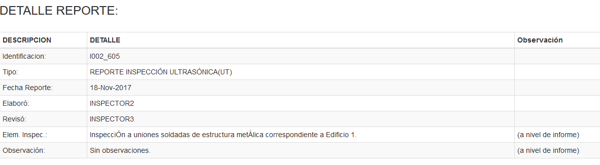 Luego de haber seleccionado la opción para mostrar el detalle de un reporte, se logra la siguiente imagen
