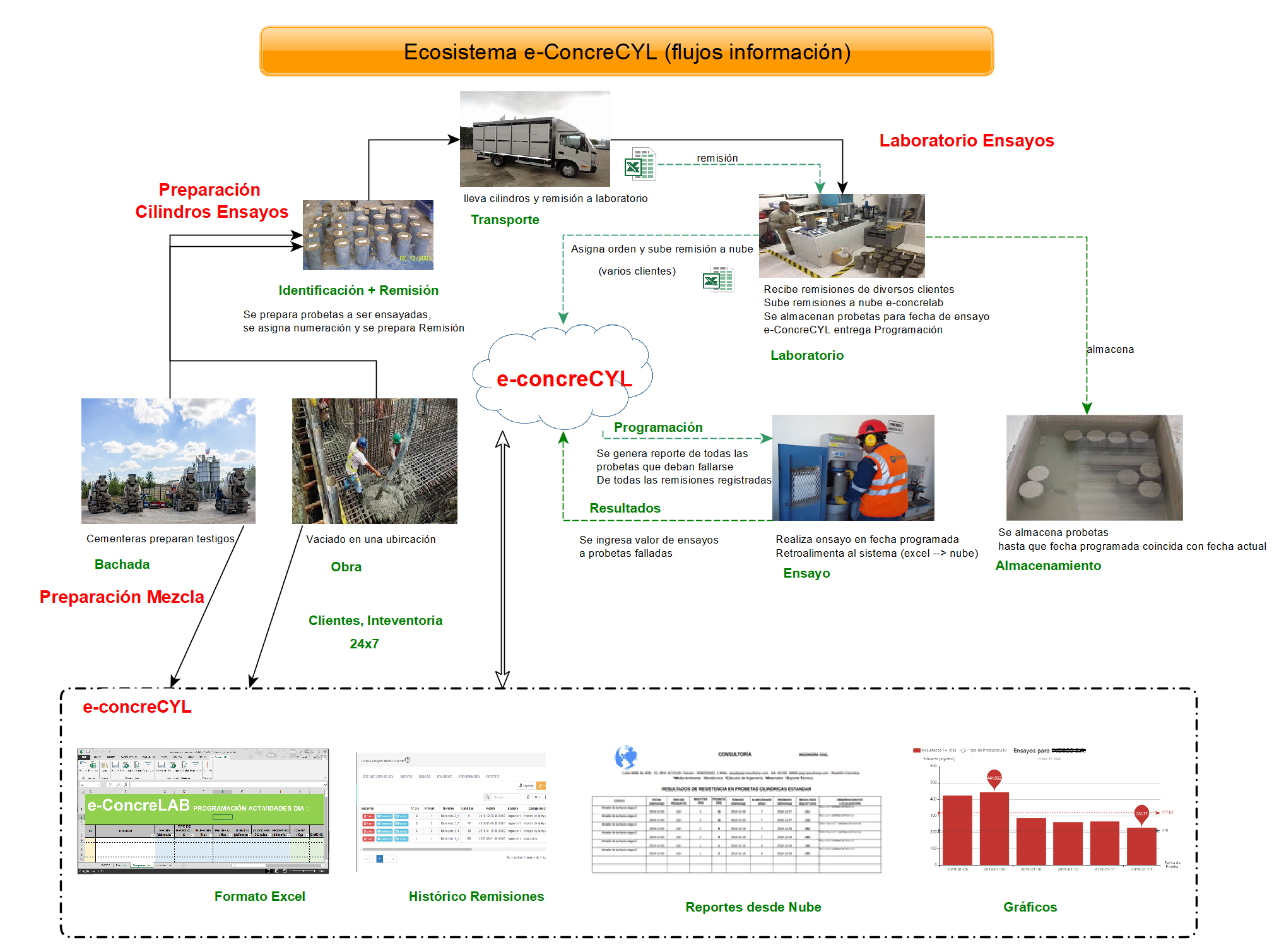 El Sistema e-concreCYL es un módulo de Empresas virtuales orientado principalmente a Controlar el manejo de información relacionado con ensayos de Cilindros de Concreto. Permitiendo visualizar en todo momento visualizar las remisiones y controlando las fechas de los ensayos.
