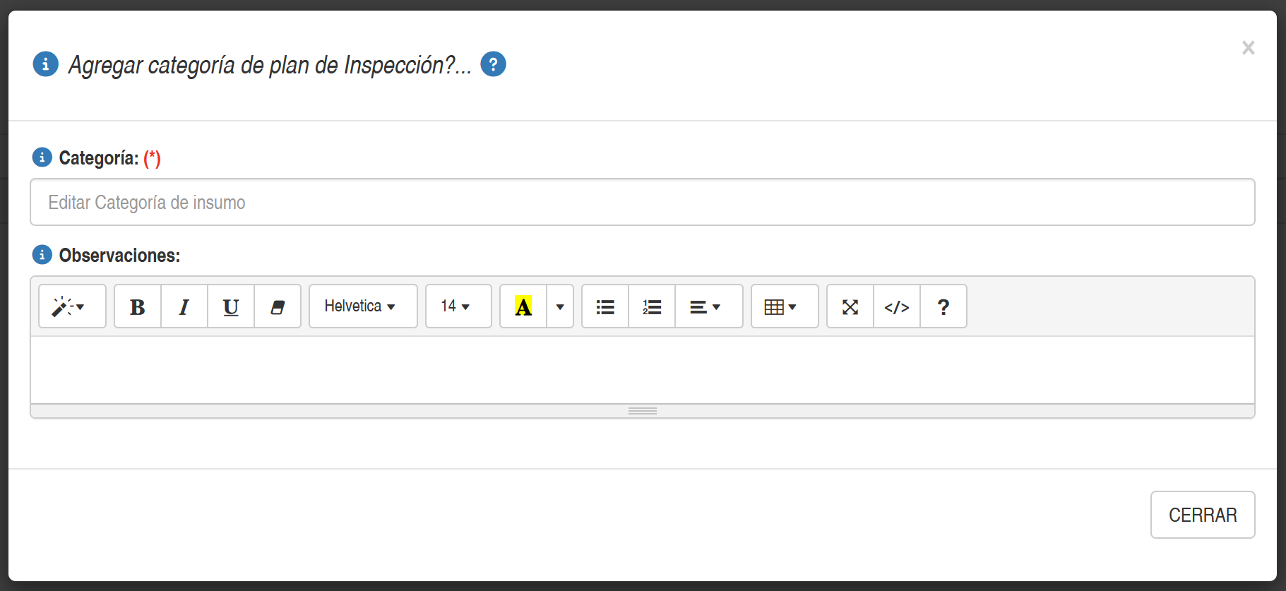 Al presionar el botón Editar o Agregar de una determinada categoria del plan de inspección, se presentará una ventana emergente tal como se muestra en las figura a continuación.