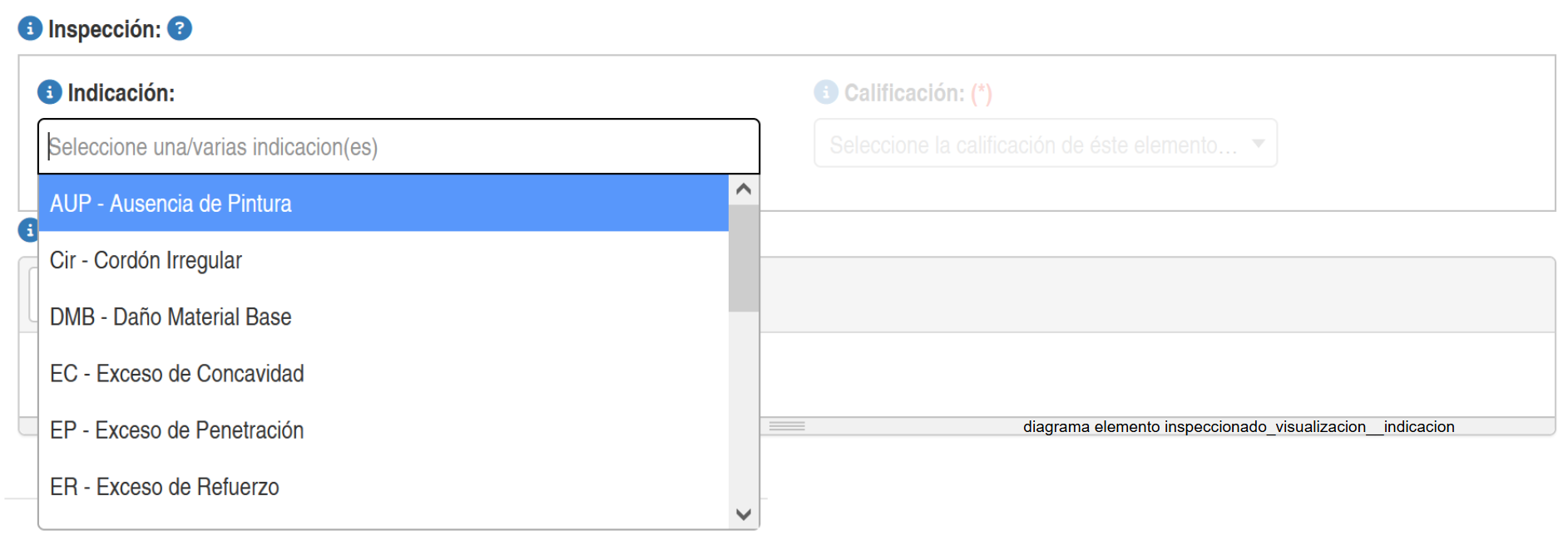 Este campo indicado corresponde a un campo de selección múltiple donde el inspector selecciona la(s) indicaciones encontradas.