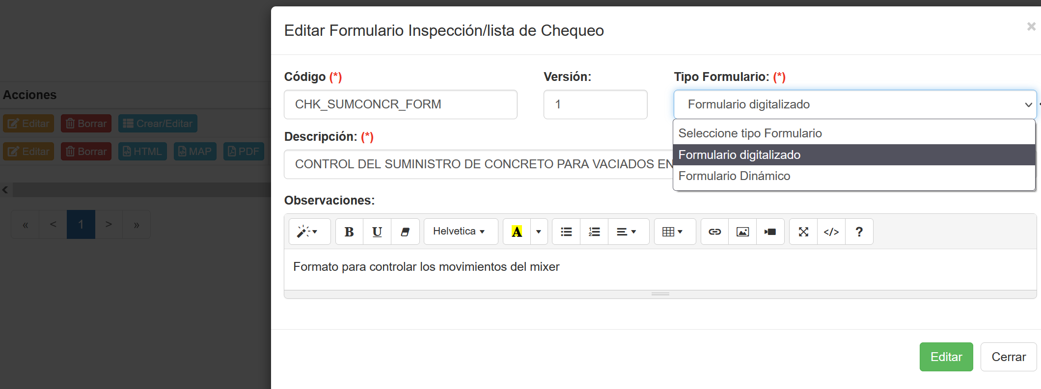 Esto se realiza activando la opción Configuración de la familia de inspecciones y seleccionando la pestaña Definición Formularios