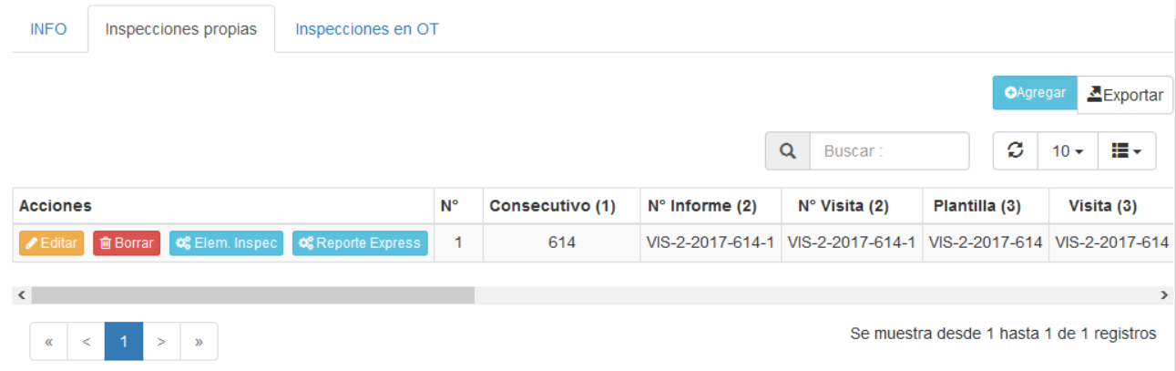 ACCIONES Botones de Acción asociados a cada inspección registrada en ésta tabla. se distingue: