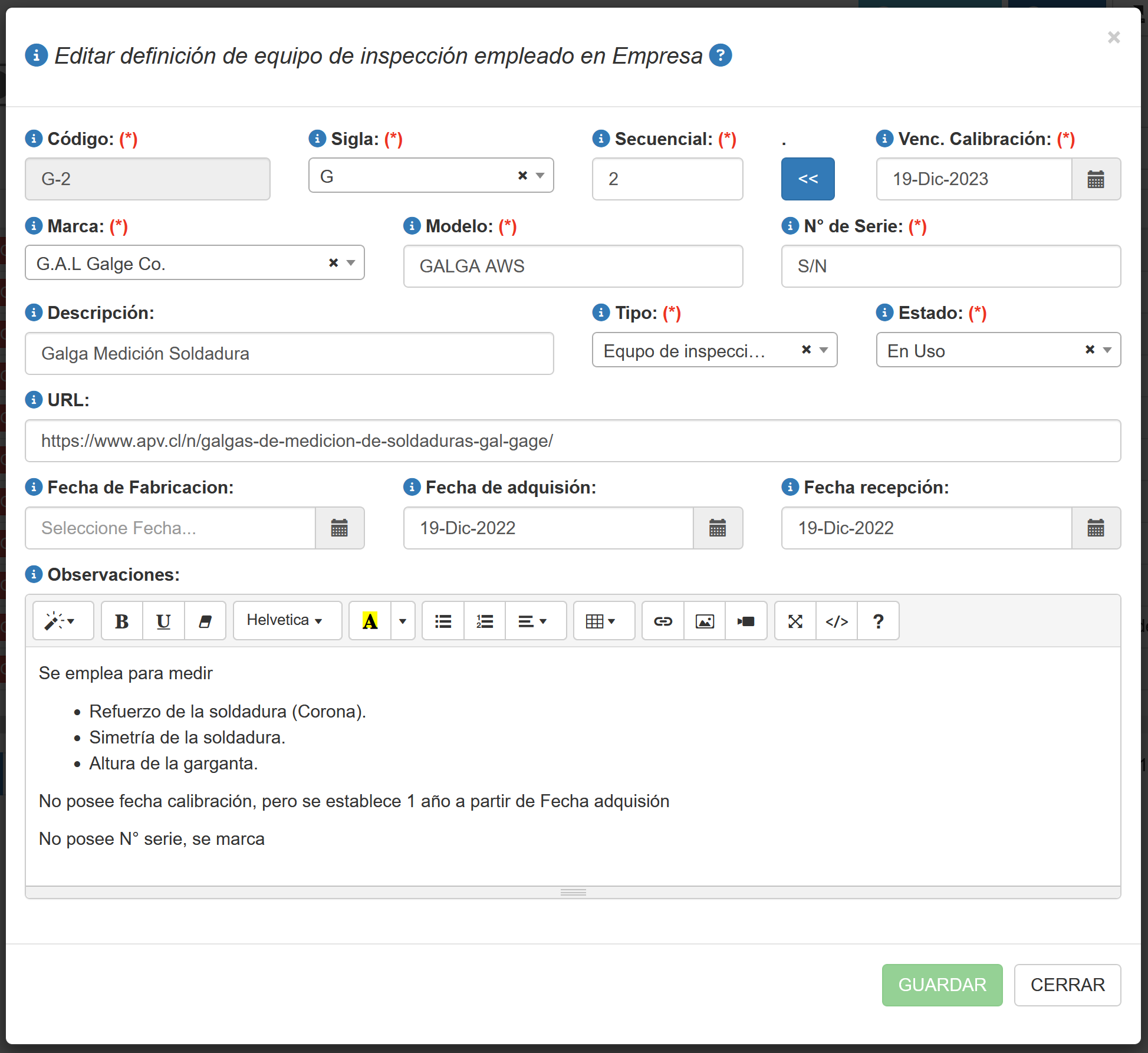 Al seleccionar el botón Crear/Editar de un determinado equipo , aparecerá una ventana emergente con datos para Crear(en blanco) o Editar (con datos de la respectiva fila) tal como se muestra a continuación.