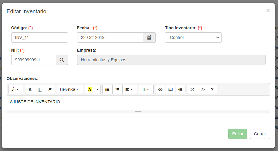 Al seleccionar el Botón "Agregar" o "EDITAR" de un determinado Item del listado de inventario aparecerá una ventana emergente tal como se muestra a continuación.