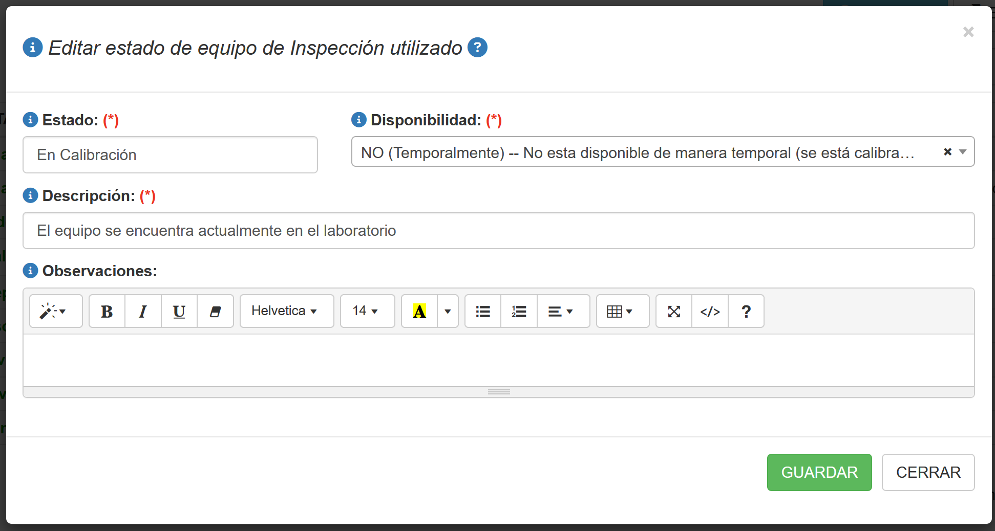 Al presionar el botón Editar/Agregar aparecerá una ventana emergente que permite Editar/Agregar un determinado Estado en que se pueda encontrar un equipo de inspección, tal como se muestra en la ventana a continuación.