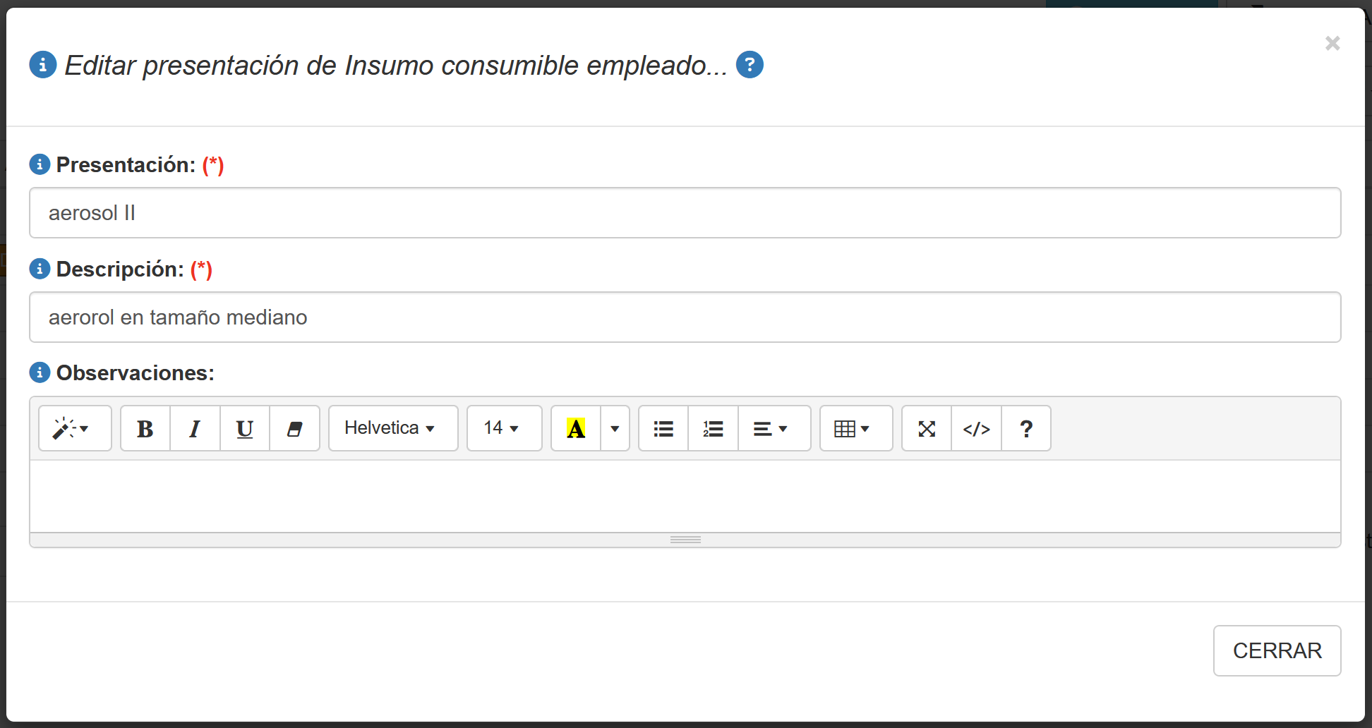 Al seleccionar el botón Crear/Editar de la pestaña presentación de Insumos , aparecerá una ventana emergente con datos para Crear(en blanco) o Editar (con datos de la respectiva fila) tal como se muestra a continuación.