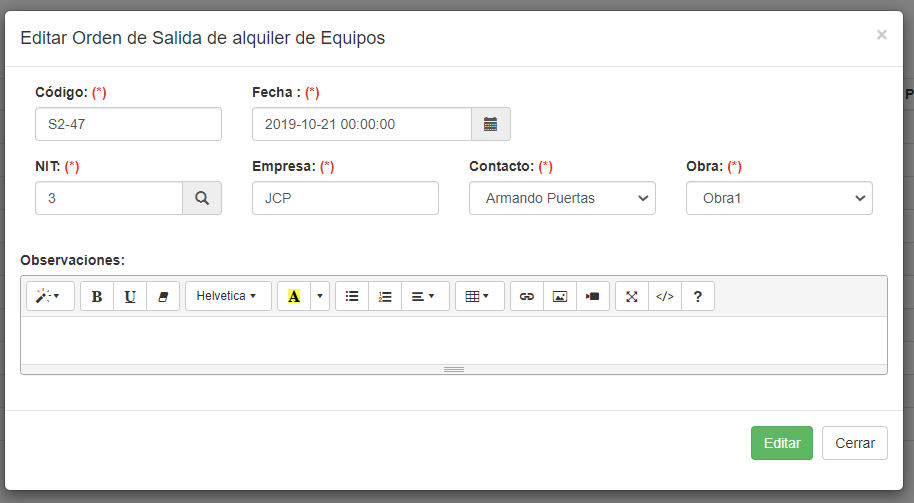 NIT NIT de la empresa que alquila el equipo, puede ser el dueño o sub alquilado. El campo de NIT es un con la característica de Autocompletado, a medida que se escribe se presentan soluciones. Al seleccionar el NIT se llenan los campos de Empresa, Contactos y OBRA
