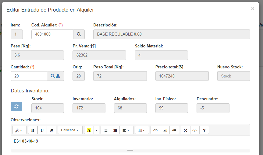 Fig 619 Extracto de Pantalla, ventana emergente para ingresar/modificar datos de producto en Alquiler.
