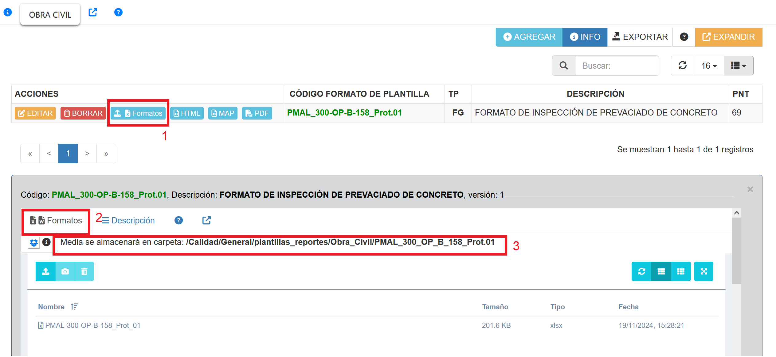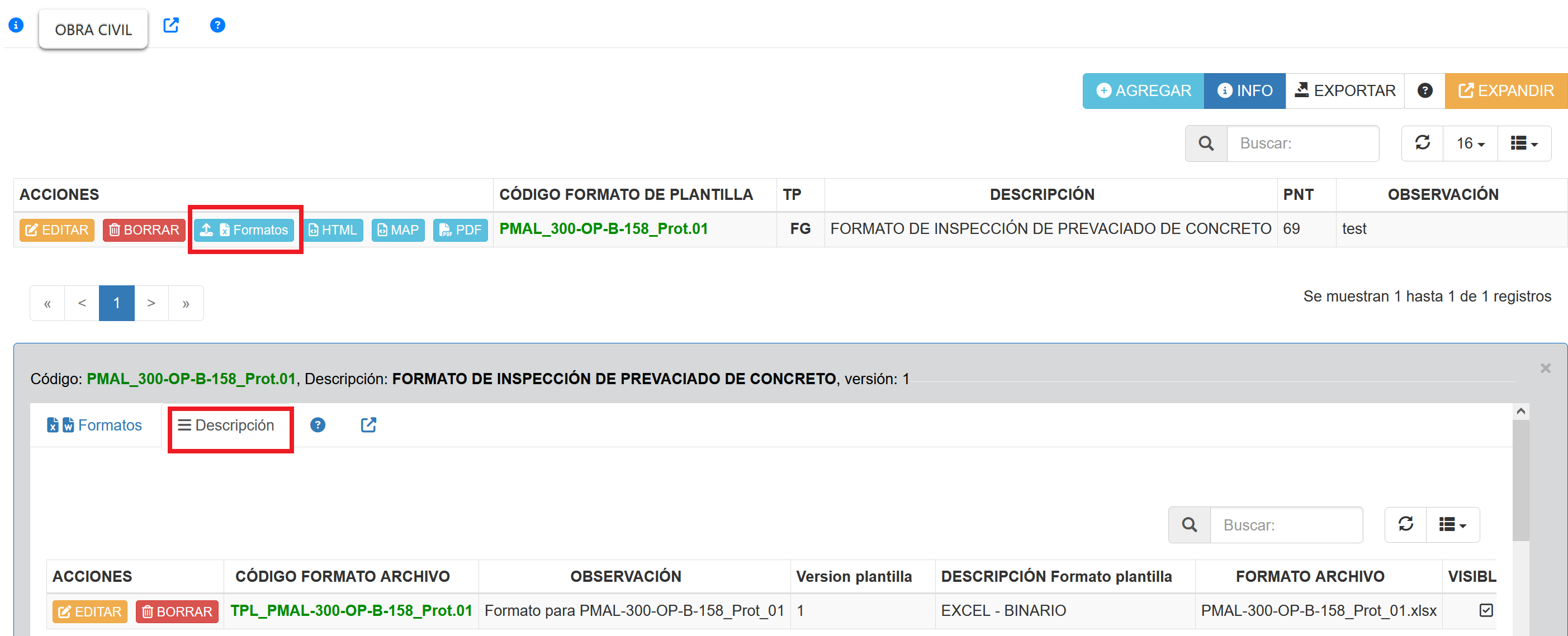 Recordar que por cada plantilla de inspección de Obra civil que se defina en el sistema . Se puede emplear varios formatos. Por cada formato debe ser debidamente registrado.