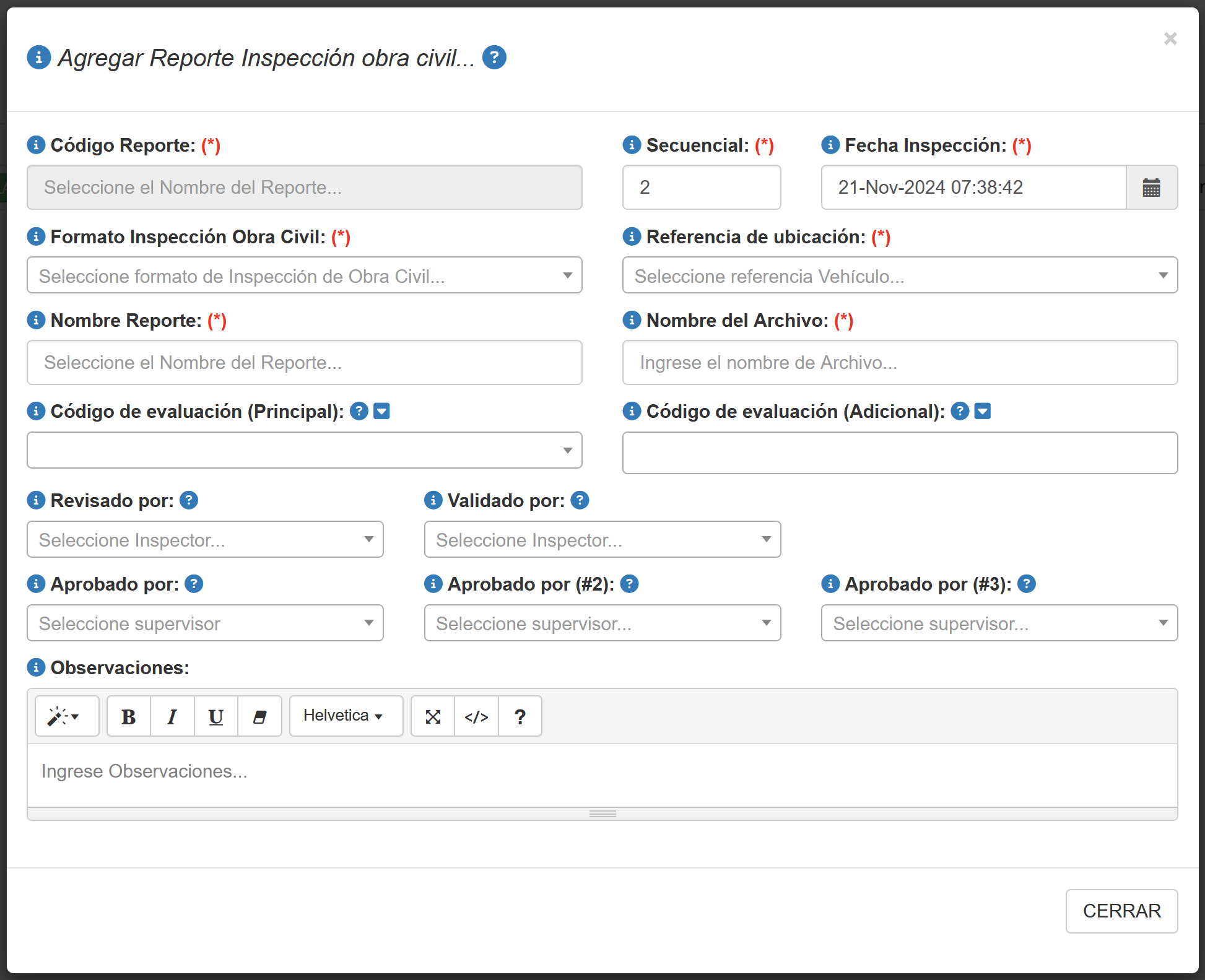Permite seleccionar el formato de Inspección de obra civil a emplear. Este formato debe estar previamente definido en el sistema. |