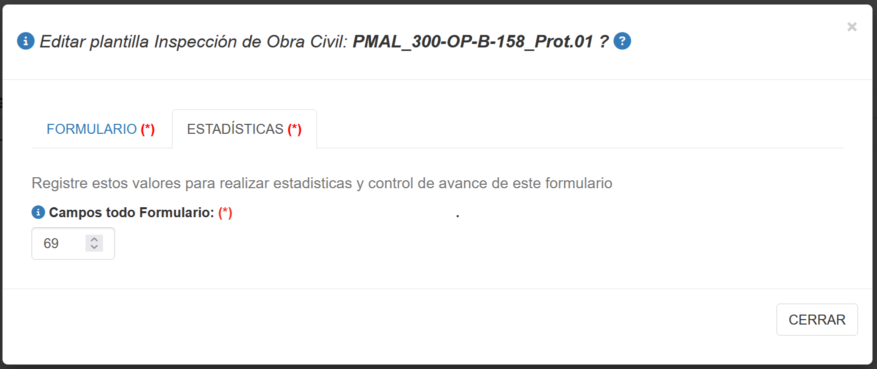 Permite definir el N° de campos a rellenar que tiene este formato. Se recomienda ingresar in valor cualquiera inicialmente y cuando se trabaje con el formulario, en el botón estadísticas arrojará el valor |