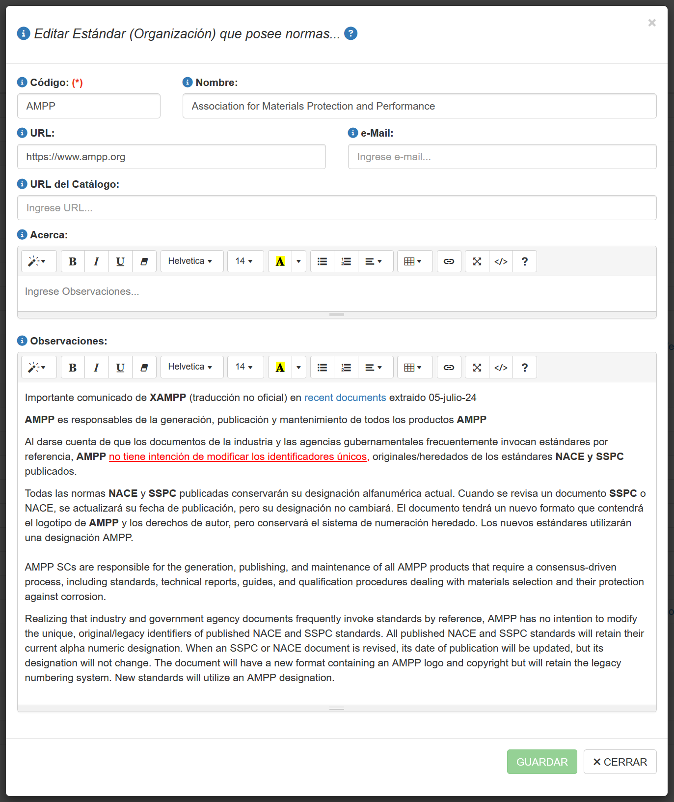 Al presionar el botón agregar/editar se activa una ventana emergente con la opción de agregar/editar información de un estándar u Organización que posee normas, tal como se muestra en la imagen a continuación.
