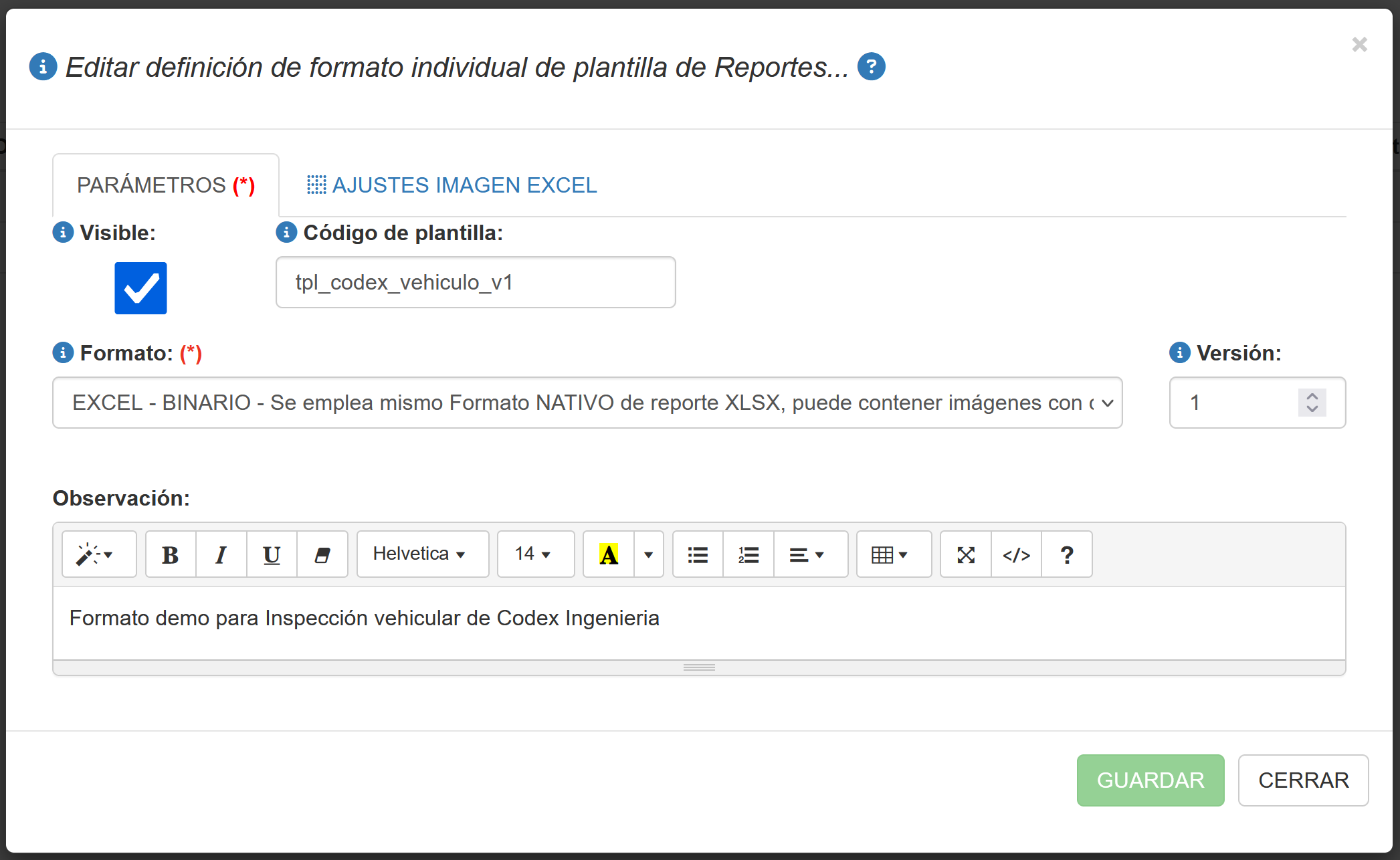 Al seleccionar la opción Editar de la descripción de un formato individual que se carga en el sistema (formato de reporte) aparece una ventana emergente con una serie de pestañas, que permitirá definir o editar la información del formato individual de plantilla de reportes tal como se muestra en la siguiente figura.