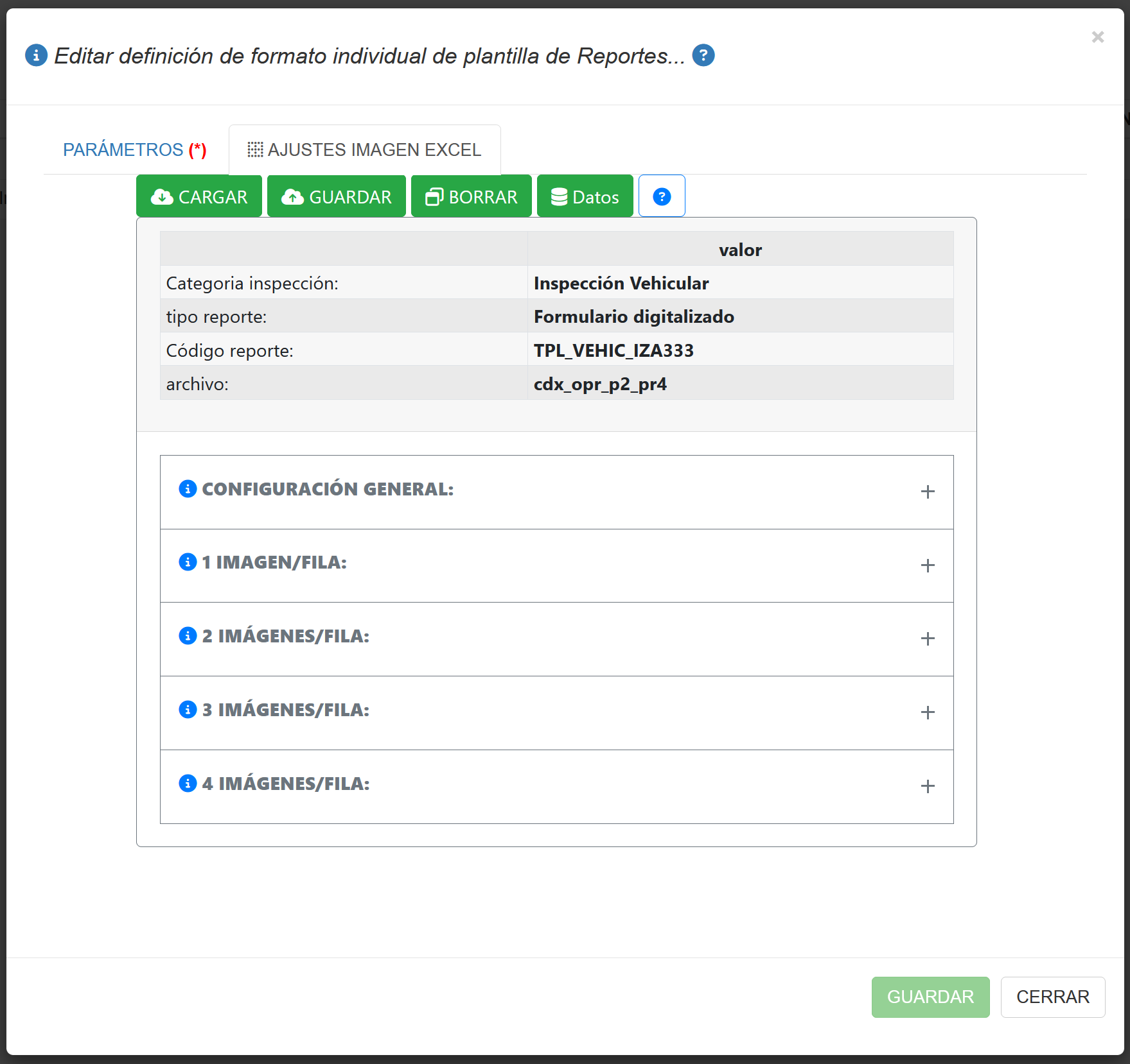 Esta pestaña es la que permite ingresar los datos principales de la información del formato individual de la plantilla de reportes.