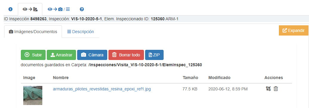 Portada / Orden de Trabajo (OT)/Detalle Orden Seleccionada / Opciones de Familia de Inspección/Visitas de Inspector/Inspecciones/Media del Elemento Inspeccionado/ Agregar - modificar Media.