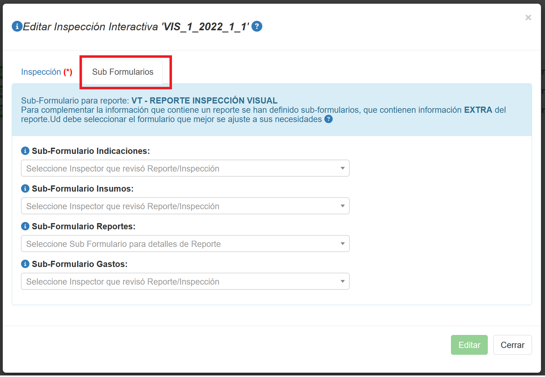 /Agregar o Editar Inspección/ Pestaña Sub formularios