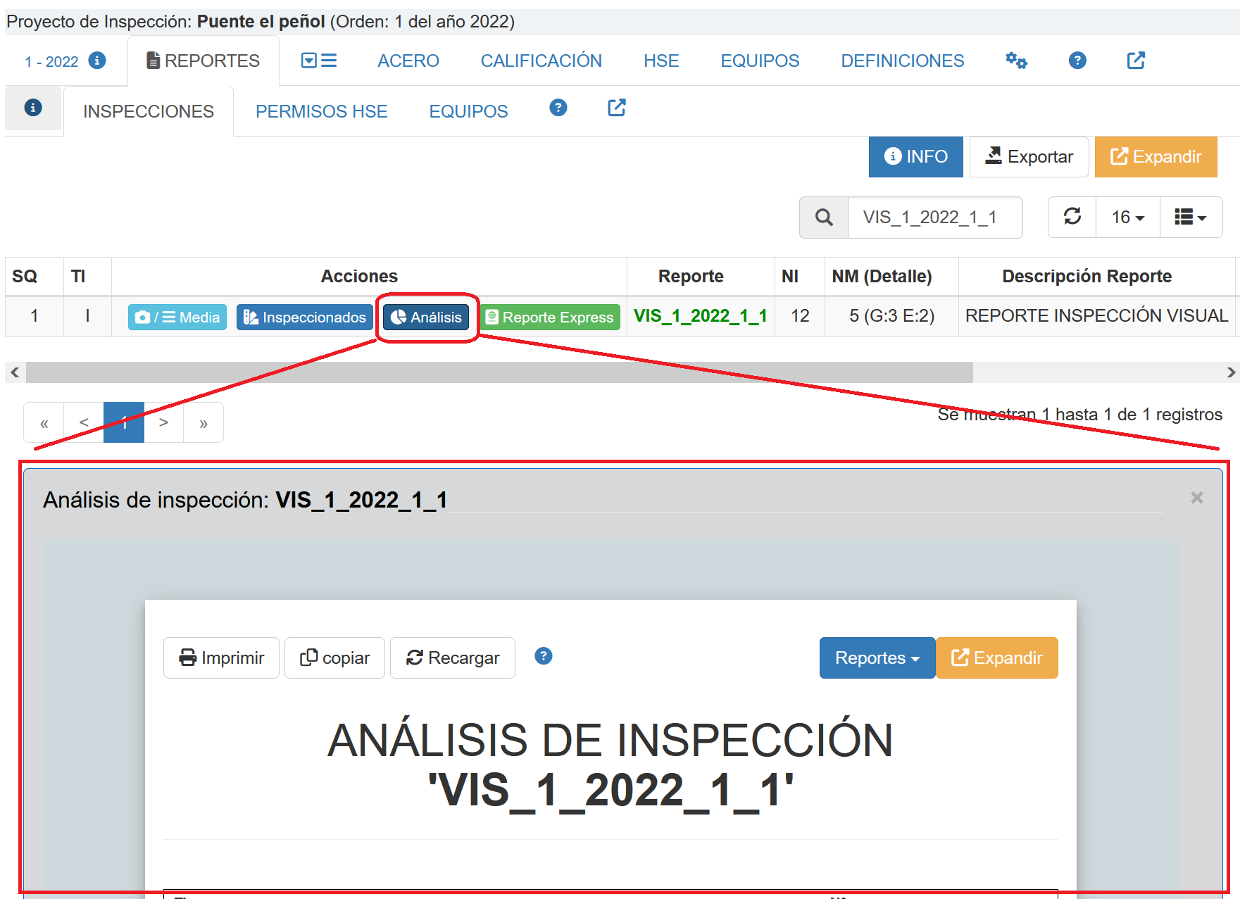 Fig 304 Extracto de Pantalla con detalle de reporte Análisis de inspección de un determinado reporte de inspección.