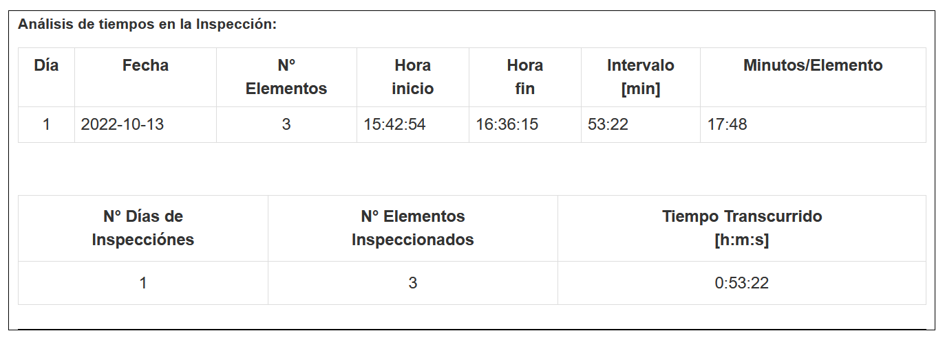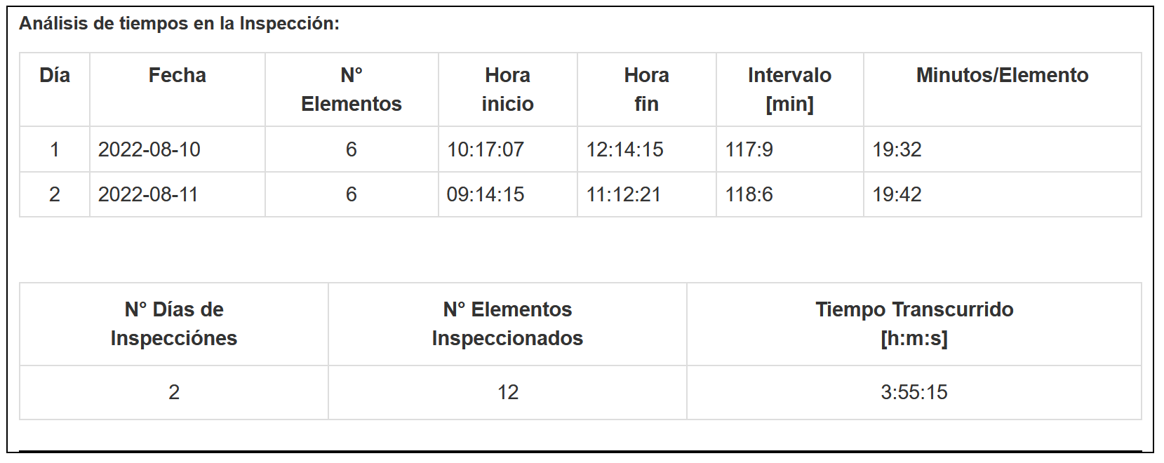 El el análisis del tiempo, se considera el tiempo menor (inicio), el mayor (fin). La resta entre esos dos tiempos será el tiempo transcurrido. Este análisis se hace por dia, por lo que el sistema capta si un reporte se ha realizado en más de un día, ya que agrupa la información y cálculos por día, tal como se aprecia en la siguiente imagen. tiene mas dias Por lo que el análisis del tiempo considera el tiempo de inicio, el final y saca promedio de tiempo por inspección.