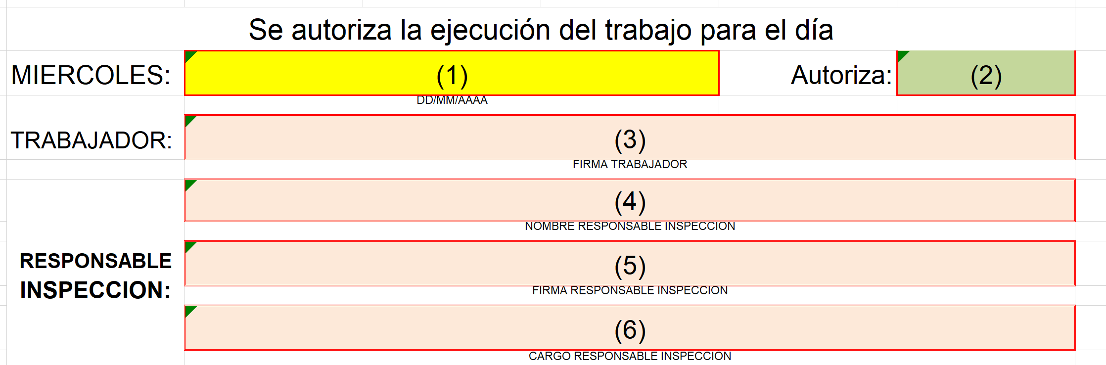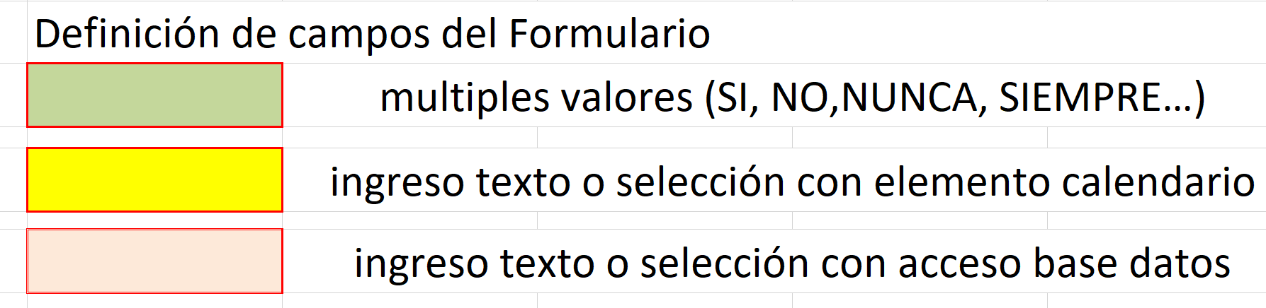 oLos campos en diversos colores permiten definir que el contenido se rige a ciertas condiciones o formatos. En este caso puntual se tiene: