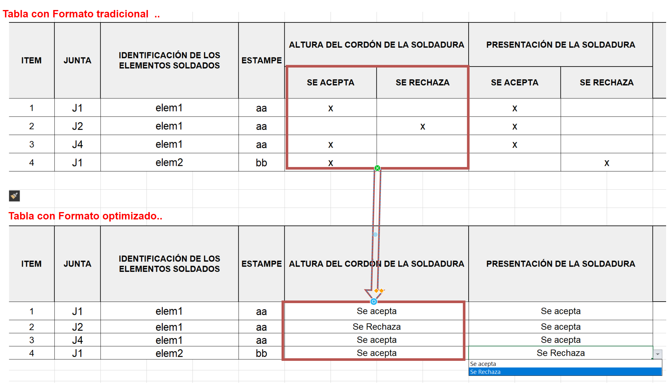 Con respecto a automatización se aconseja que celda no tenga una X para referirse a un acepta/se rechaza para un atributo como Altura del cordon de la soldadura o Presentación de la soldadura