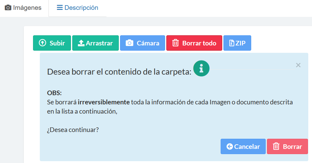 Esta opción permite borrar todas las imágenes/documentos asociados a ésta reparación. También se borrará la carpeta.