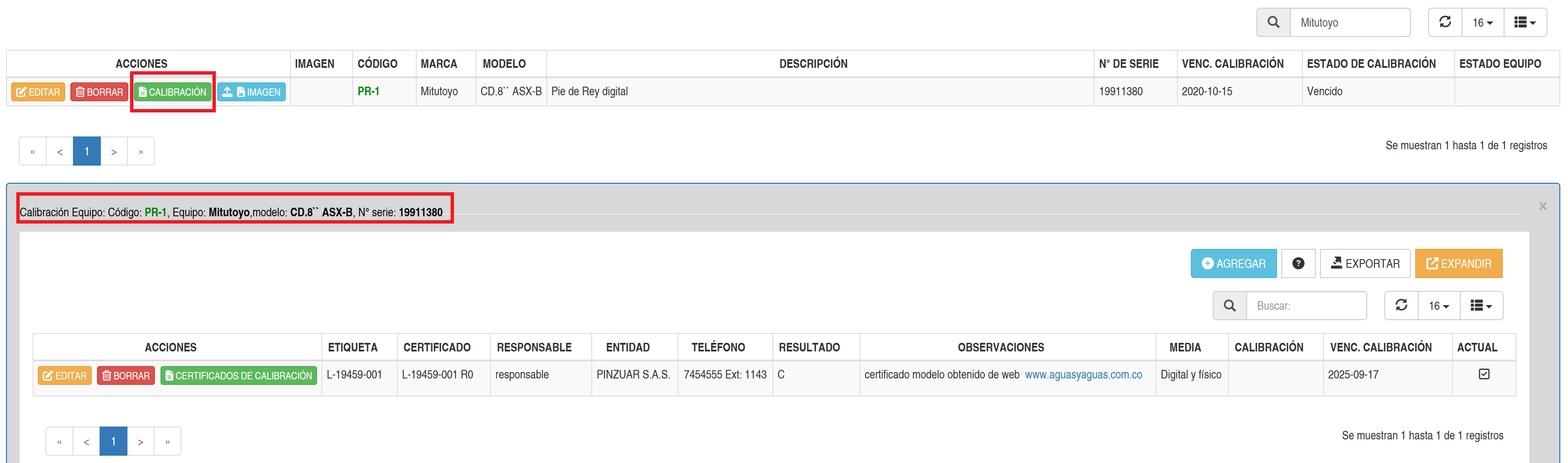 Al seleccionar el botón Calibración de un determinado equipo , se expandirá una ventana que permitirá mostrar la/las calibración(es) que se le han realizado a un equipo (histórico), tal como se muestra en la imagen a continuación.