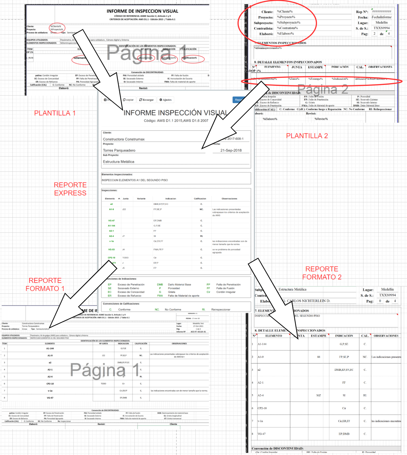 Reporte Express: Configurable:Panel de control de ajustes permite determinar: •Visualización de componentes del reporte (imágenes, descripción indicaciones etc..) •Etiquetas de imágenes •Cantidad de imágenes por fila. •Opciones disponibles irán aumentando en el tiempo Exportar: Desde la web se genera reportes: •Excel: emplea plantillas predefinidas para generar reportes, no incluye imágenes •Word: genera documento con imágenes (respetando configuración) si incluye imagenes •Puede exportar datos de inspección en varios formatos |