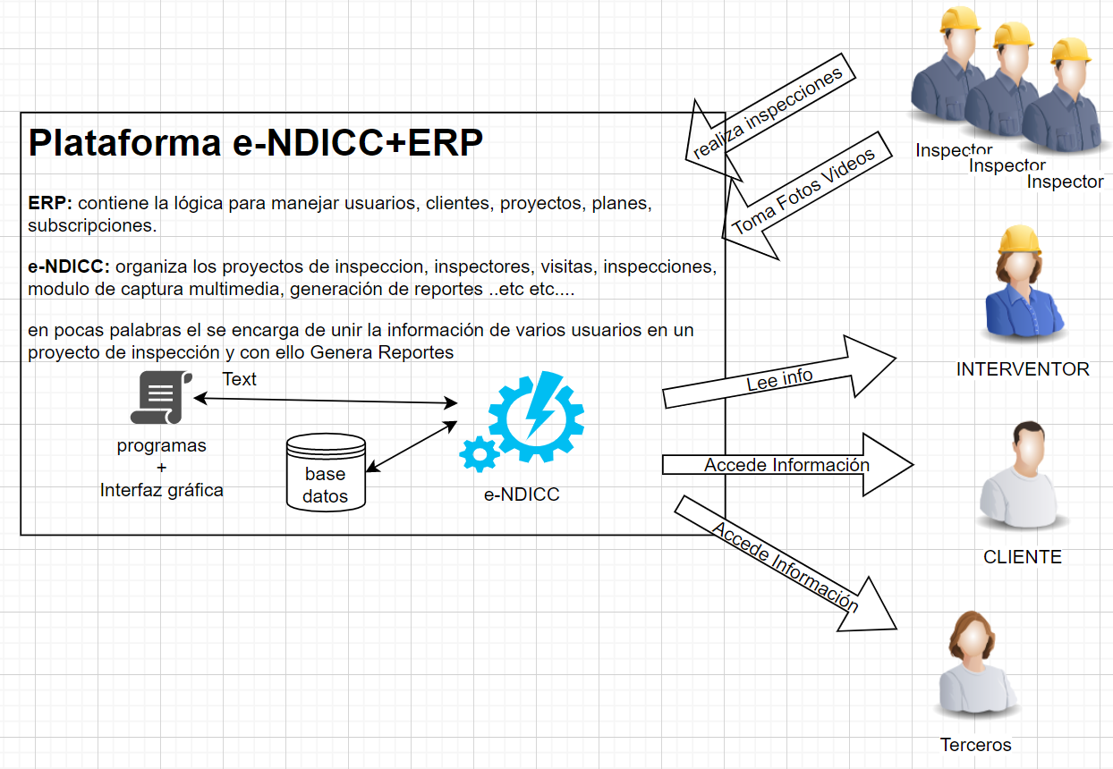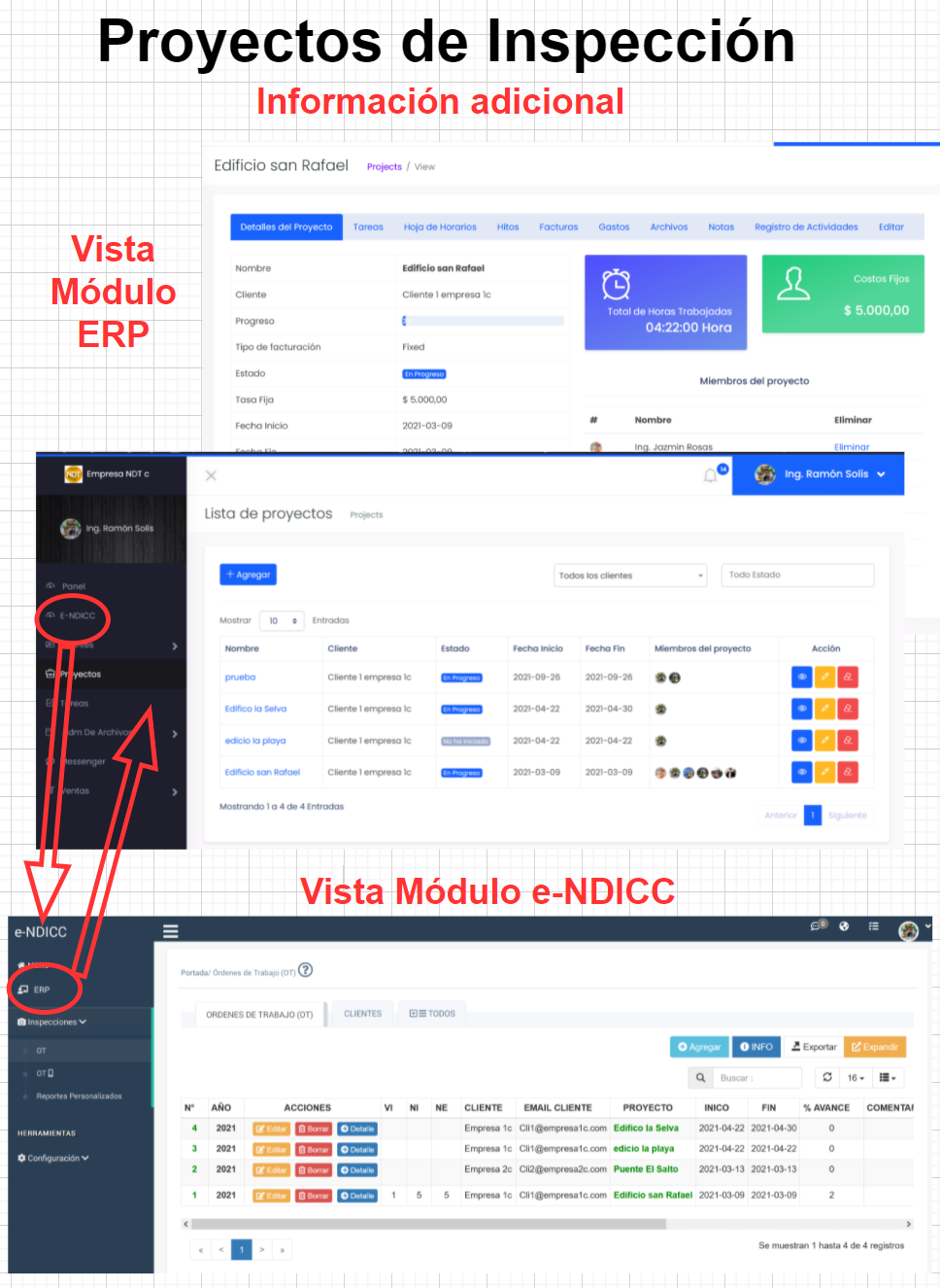 Proyecto de Inspección •Recursos HH •Tareas •Horarios •Hitos •% Avance •Notas •Etc… Proyecto creado en Vista de módulo ERP se refleja en Vista de Módulo e-NDICC y vice versa. |