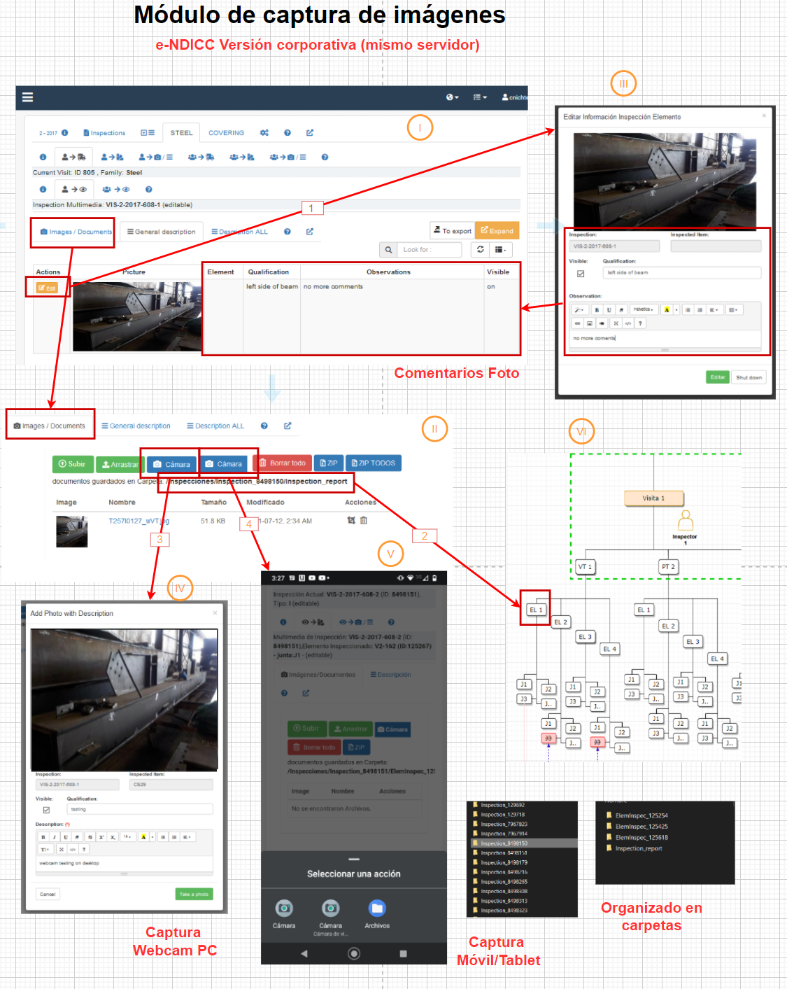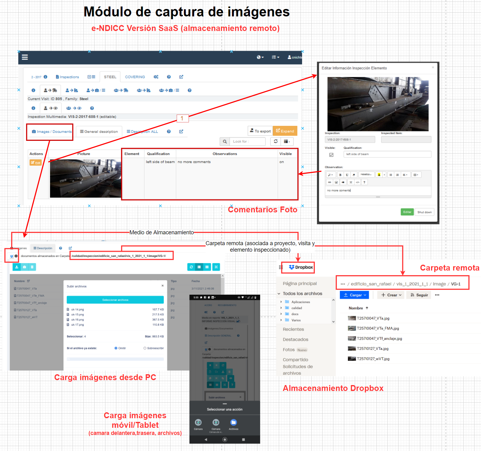 Módulo de Captura de Imágenes Cada versión tiene su propio módulo de captura de imágenes Programas totalmente distintos, empleando tecnologÃas para el usuario de manejo similar e-NDICC Versión corporativa: •Imágenes se almacenan en mismo servidor •crea carpeta de acuerdo a Visita/elemento inspeccionado •Visor lee contenido de carpeta y muestra miniaturas •Carpetas organizadas por inspección y elemento e-NDICC versión SaaS. •utiliza configuración de almacenamiento remoto •Lee información de Proyecto, elemento y crea carpeta para imágenes •Visor lee contenido de carpeta y muestra miniaturas •Carpetas organizadas por inspección y elemento |