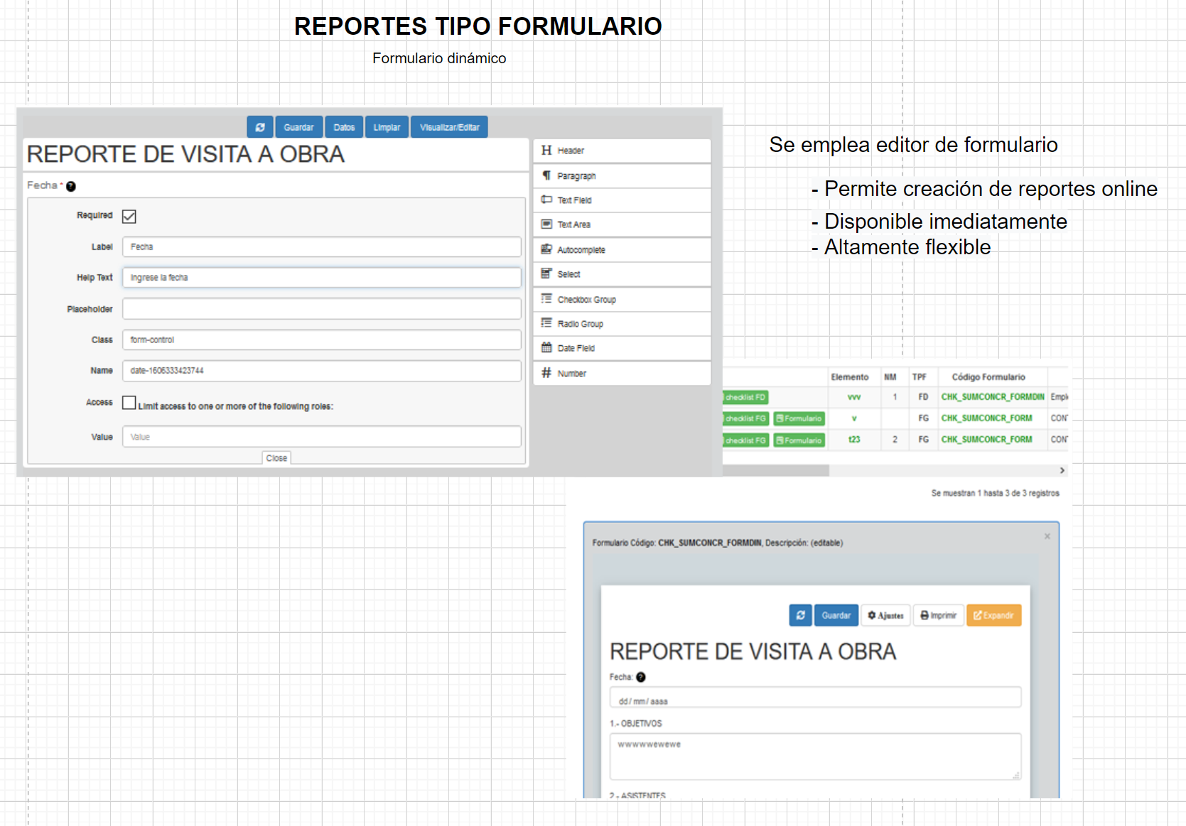 Reportes tipo Check list o Formulario dinámico •Generado con editor arrastrando elementos gráficos •Posterior tratamiento de datos, por ejemplo evolución en el tiempo •maneja Fotos (a) (a) Por el momento disponible solamente en versión Corporativa |