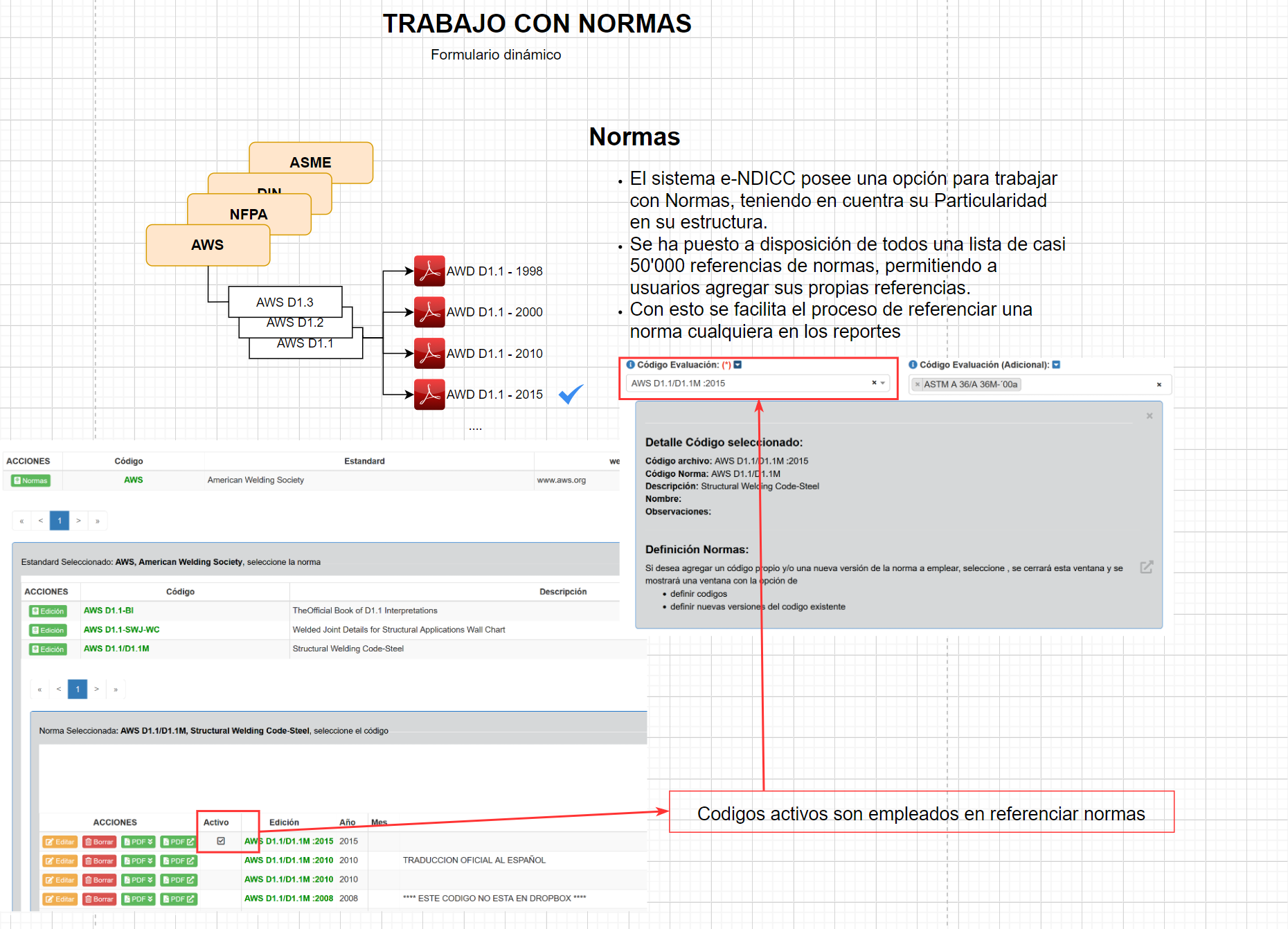 Trabajo con normas •Se dispone de opción para visualizar y agregar estándares , normas y ediciones de códigos de acuerdo a necesidad. •Se pone a disposición algunas normas de algunos estándares (con nombre y referencia para facilitar búsqueda) •Referencias activas se emplean en reportes |