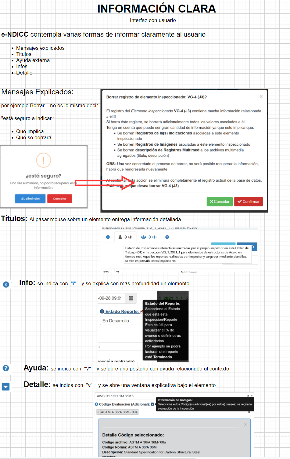 Información Clara Junto con emplear diversos elementos gráficos que facilitan la vida al usuario, se tiene especial cuidado con aquellos elementos que implican una acción, para ello se informa al usuario, con los siguientes elementos •Mensajes explicados: No solo se informa la acción sino que se entrega un detalle de lo que implica. •TÃtulos: al pasar ratón sobre elemento aparece un recuadro con el detalle que ésto implica •Ayuda externa: se invoca en una pestaña nueva la ayuda •Infos: en un globo de información se entrega información adicional •Detalle: se abre una ventana y se presenta un detalle de ese item, esto puede involucrar acciones adicionales |