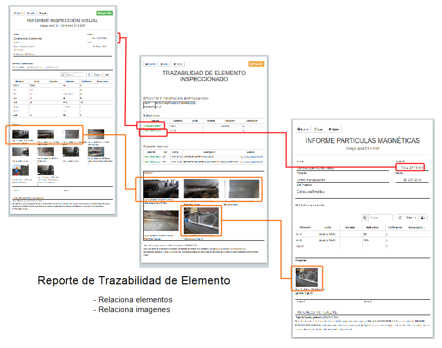 Trazabilidad El sistema e-NDICC permite en ambas versiones una trazabilidad del elemento dentro de la orden de inspección. •Automática a nivel de elemento, seleccionando botón trazabilidad, se muestra un reporte que indica donde adicionalmente se ha inspeccionado el elemento •Utiliza Imágenes de diversos reportes relacionadas con elemento |