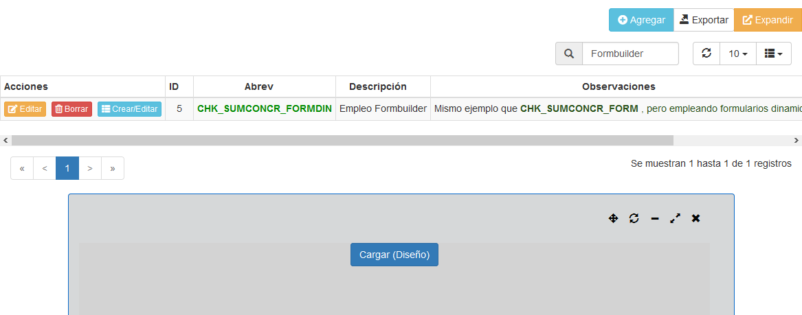 Al Seleccionar un formulario previamente definido con el botón "Crear/Editar", lo primero que aparece es un area grís con una opción para cargar el formulario de la base de datos.