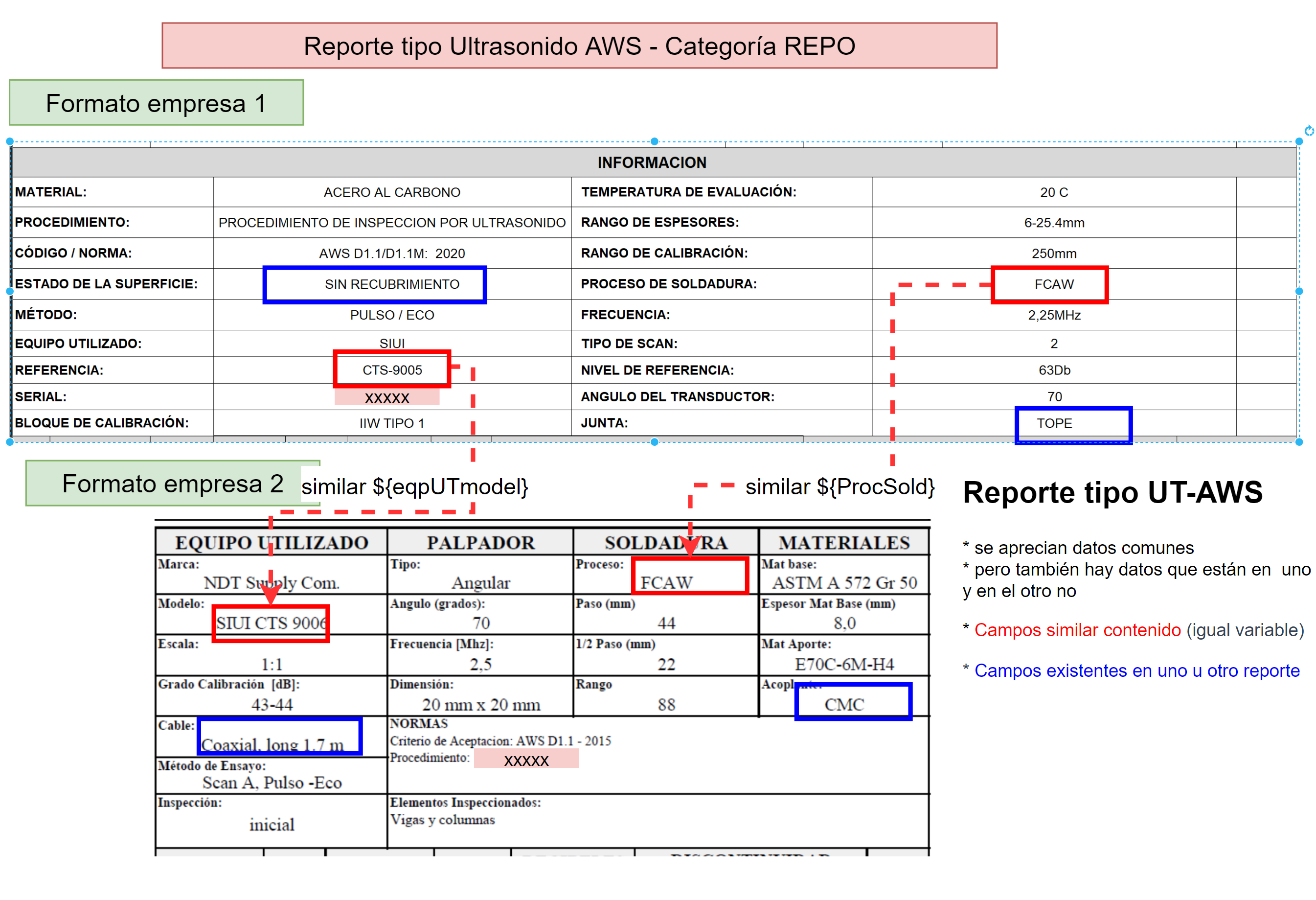 Fig 1172 Comparación extracto de Reporte de Inspección Ultrasonido según AWS de 2 empresas
