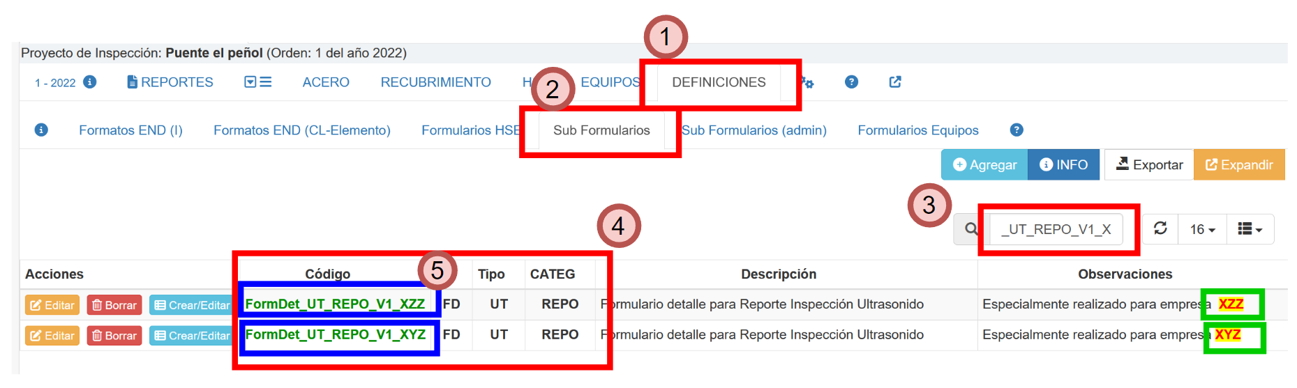 En este caso se recomienda crear dos sub-formularios, ir a definiciones (1), seleccionar Sub-formularios(2), crear los sub-formularios y luego filtrarlos (3). Ajustar bien sus códigos, identificando bien su nombre y su diferencia, ya en el código del formulario se puede apreciar. (5). En este caso con solo comprender el nombre se conoce de que se trata.