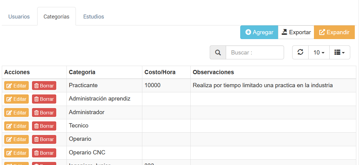 Un aspecto interesante es que con la categoría de profesión es posible asignar un costo a una determinada categoría de profesión que tenga de un usuario y con ello será posible cuantificar actividades en donde el usuario realice una actividad
