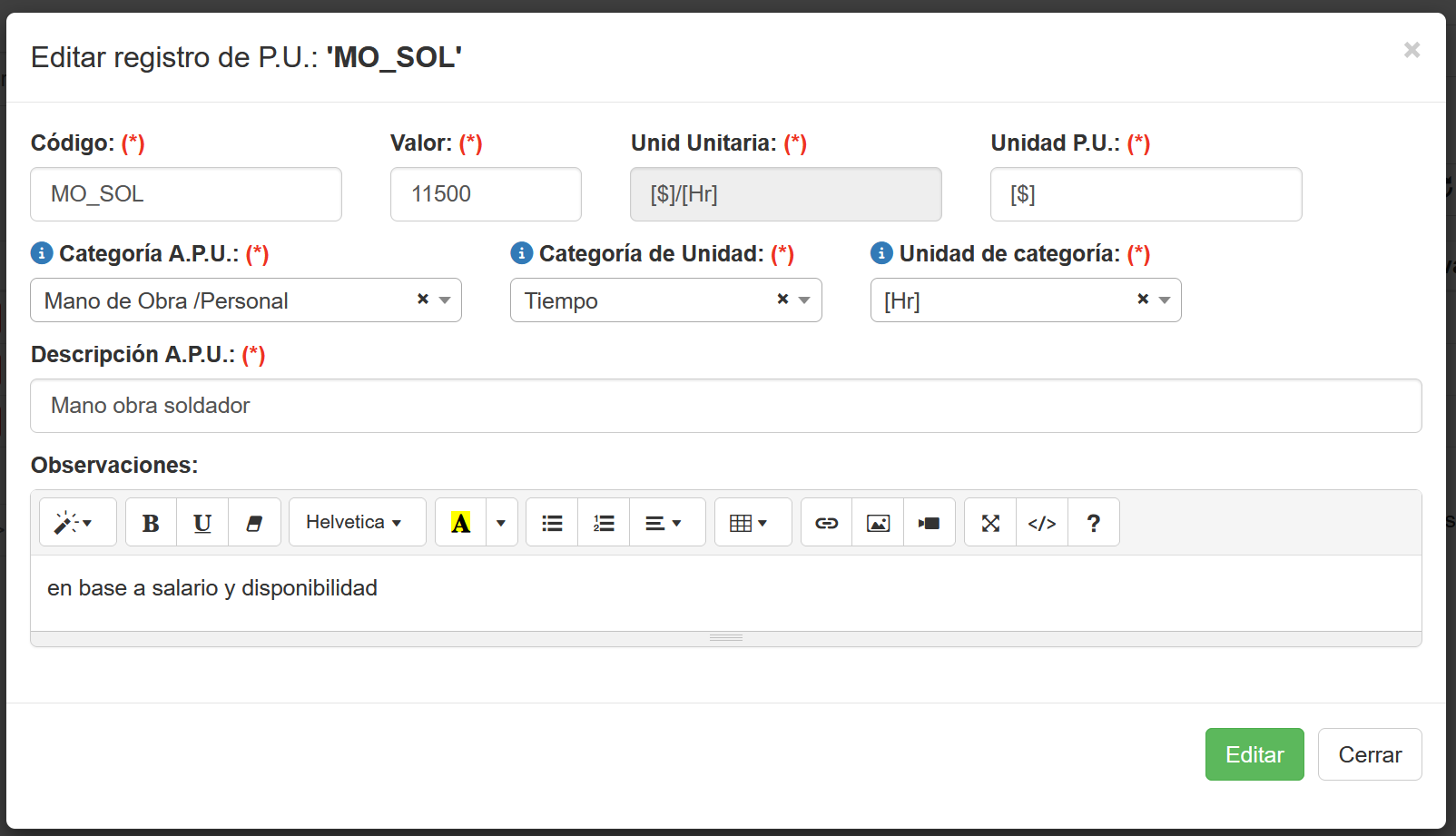 •Descripción P.U.: Breve descripción de este precio Unitario