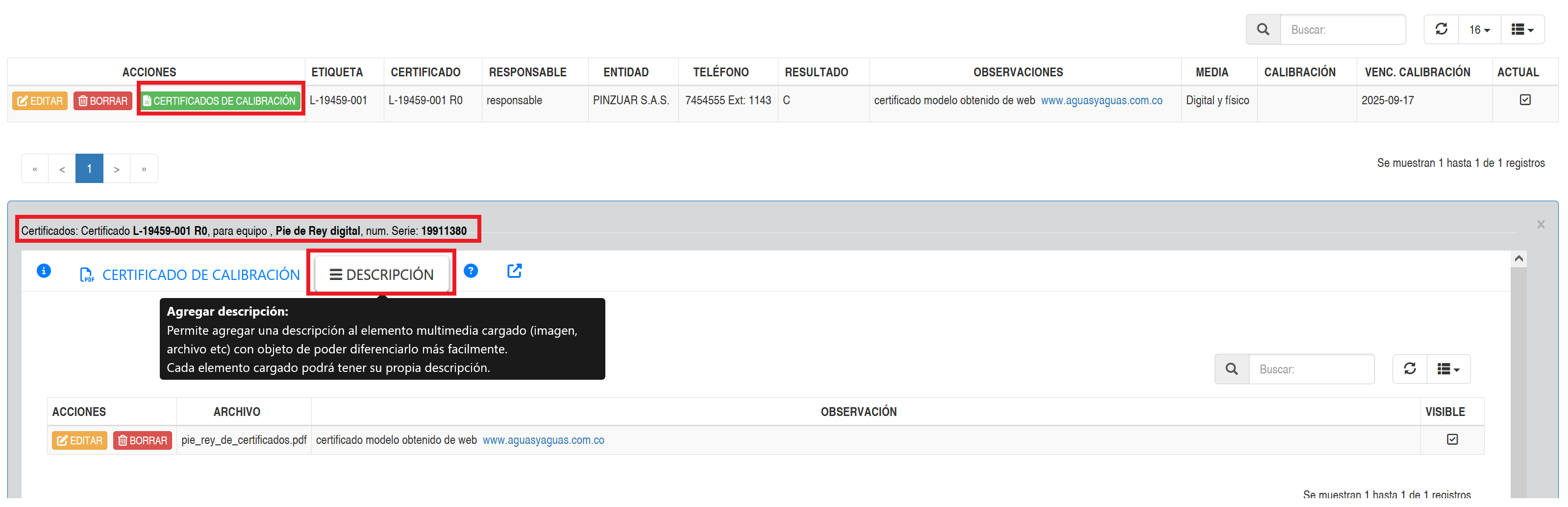 Fig 738 Extracto de pantalla, ventana detalle con listado de certificado de calibraciones de una determinada calibración de equipos de Inspección. Pestaña descripción activa.