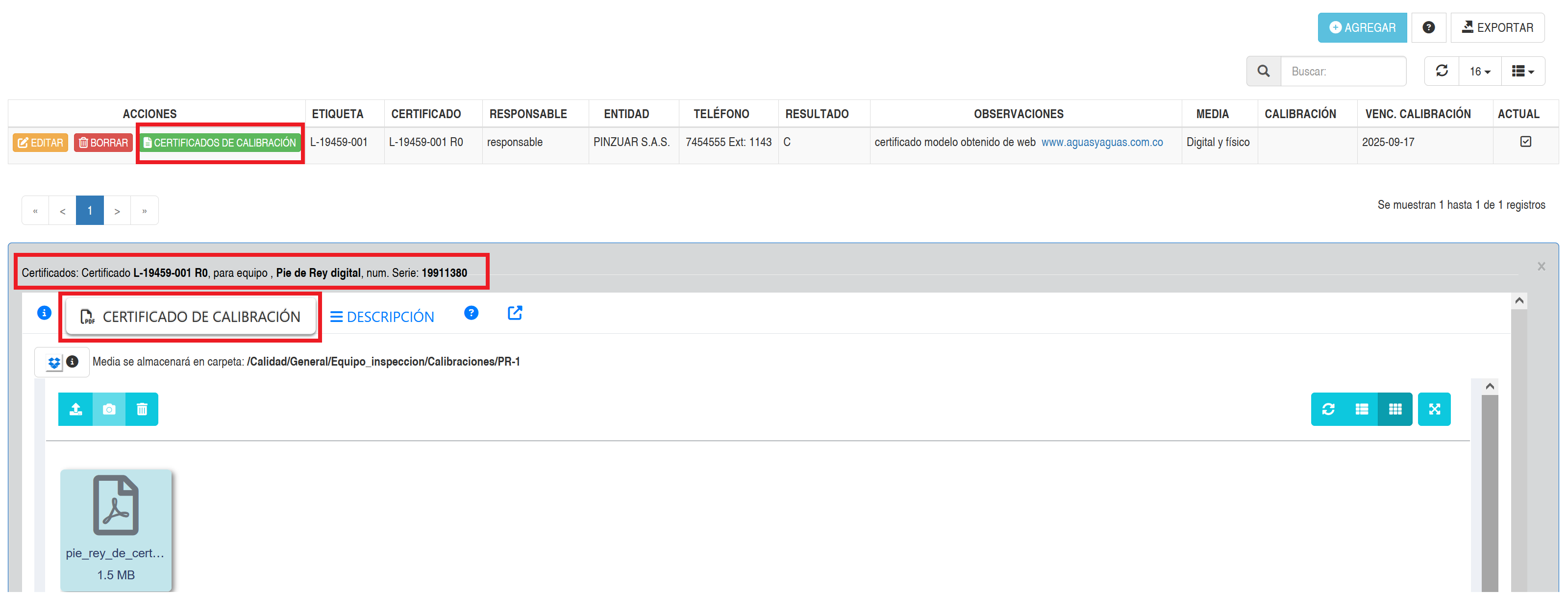 Al seleccionar el botón Certificados de Calibración de una determinada Calibración de equipo , se expandirá una ventana que permitirá mostrar el/los diversos certificados que se le han expedido a un determinado equipo de inspección, tal como se muestra en la imagen a continuación.