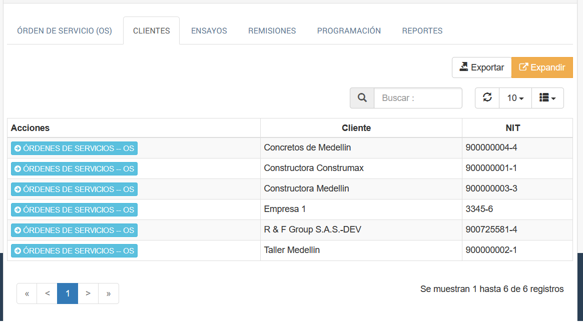 Esta opción constituye una forma alternativa de mostrar las Ordenes de Servicio, esta vez agrupadas primero por el cliente. Una vez seleccionada la PESTAÑA CLIENTES, aparece una tabla de datos, como se muestra en la siguiente figura.