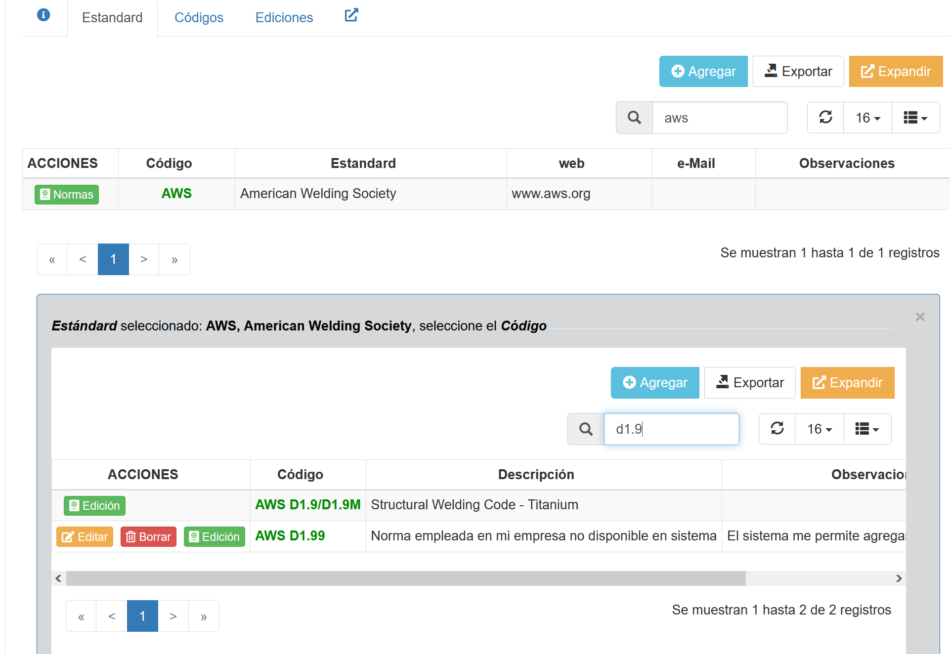 Fig 1369 Extracto de pantalla, mostrando un listado de códigos de Normas, con posibilidad de incorporar referencias adicionales por parte del cliente.
