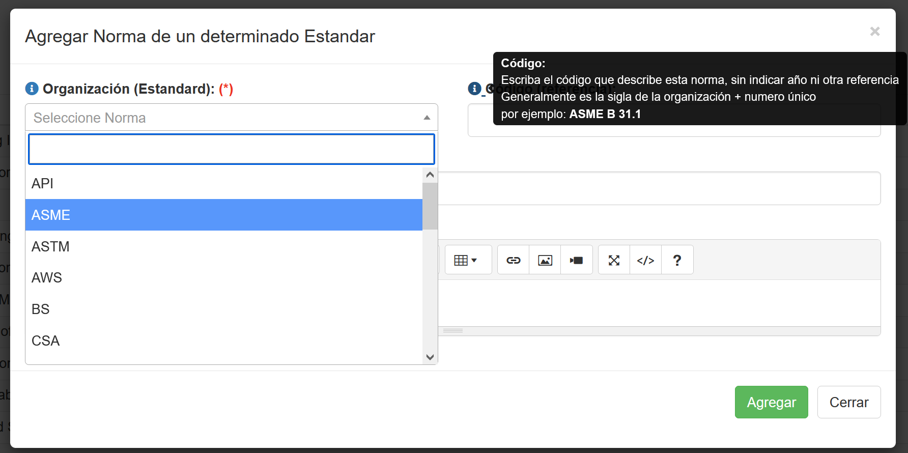 Al presionar el botón Agregar o Editar, aparece una ventana emergente con opciones para crear/modificar el registro de Estándares, tal como se muestra en la imagen a continuación.