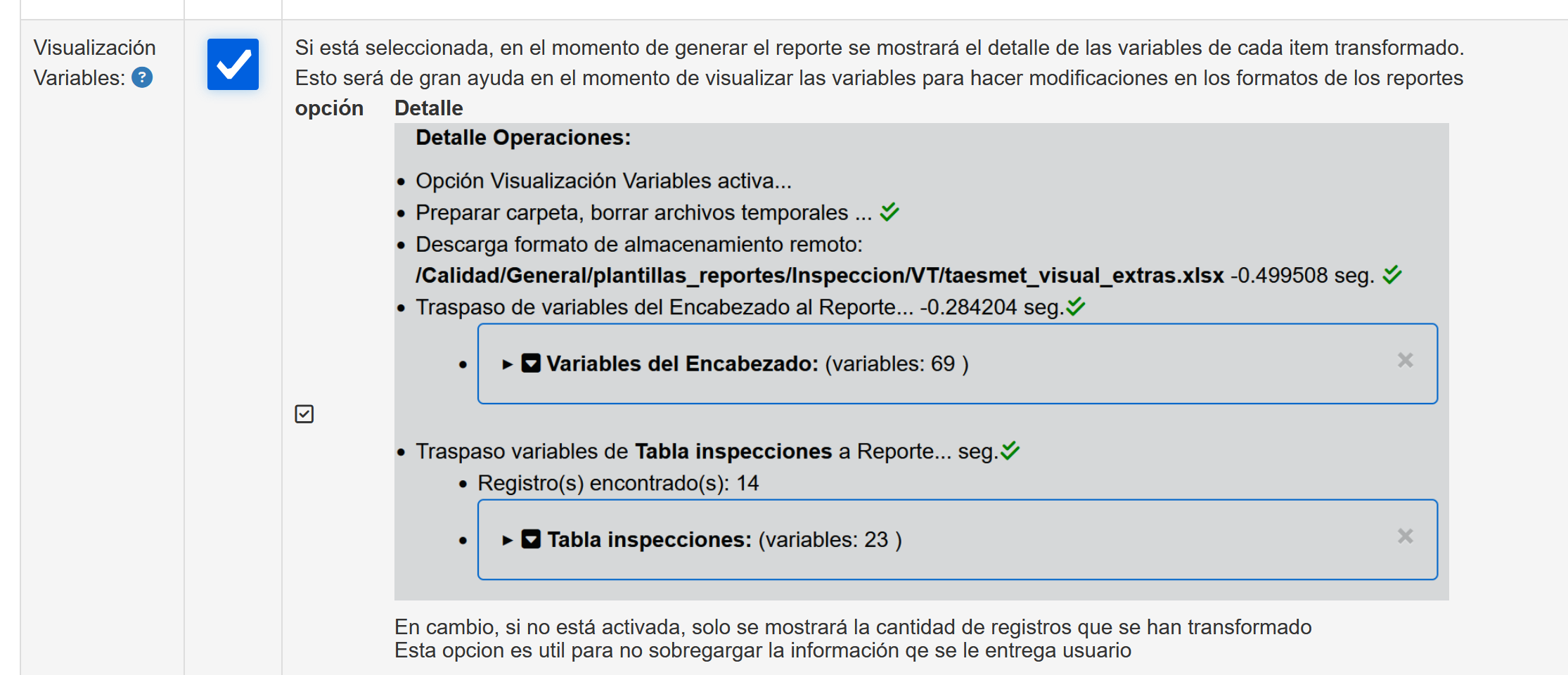 Se puede comprobar si las variables de procedimiento de inspección han sido consideradas en la generación del reporte, activando la visualización de ellas.